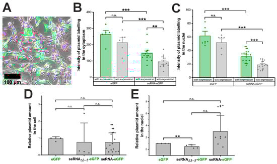 The quantification of the Cy5 signal of the eGFP and seRNA-eGFP plasmids in GFP-positive cells showed a significant difference with higher labeling intensities for eGFP plasmids compared with seRNA-eGFP plasmids. This difference was reproducibly detectable in the cytoplasm as well as for plasmids within the nucleus of GFP-positive cells (Figure 2B,C). We found lower plasmid amounts in cells that did not express eGFP, although this difference was not statistically significant. However, the eGFP plasmid was present in larger amounts in the transfected cells than the seRNA-eGFP plasmid. In a subsequent analysis, the Cy5 plasmid signal was quantified exclusively within the nucleus of the transfected cells to investigate the nuclear delivery of the plasmid. Therefore, we detected larger amounts of both plasmids within the nuclei of eGFP-expressing cells compared with the nuclei of non-eGFP-expressing cells. Once more, the quantity of the eGFP plasmid delivered was statistically significantly higher than that of the transferred seRNA-eGFP plasmid.