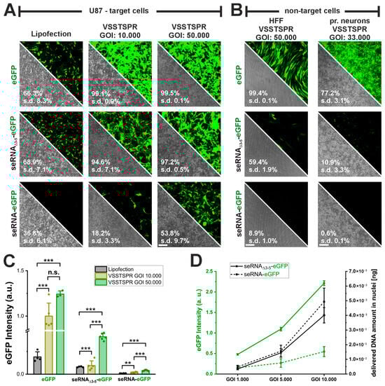 Increase in AAV vector genome transfer equally enhances seRNA expression. (A) Comparison of transfection efficiency between lipofection and AAV vectors using VSSTSPR capsid as delivery vehicle for eGFP plasmid, control seRNAΔ3-5-eGFP and seRNA-eGFP construct in U87 target cells. n = at least 3 independent samples Scale bar: 200 µm. (B). Selectivity test of AAV vectors as delivery vehicle for eGFP plasmid, control seRNAΔ3-5-eGFP and seRNA-eGFP construct in HFF non-target cells. n = at least 3 independent samples. Scale bar: 200 µm. All numbers are based on flow cytometry (C) Comparison of eGFP expression intensity post delivery of eGFP, control seRNAΔ3-5-eGFP and seRNA-eGFP construct via lipofection and AAV vectors. n = at least 3 independent samples. p-values were calculated using one-sided ANOVA. Data are presented as mean values with error bars representing s.d. (D) Analysis of eGFP expression intensity and delivered DNA amount following application of different genes of interest (GOIs) for delivery of seRNAΔ3 5-eGFP construct to the seRNA-eGFP construct n = 3 independent samples. Data are presented as mean values with error bars representing s.d. p-values of 0.01 and 0.001 are indicated with two to three *. n.s. = not significant.