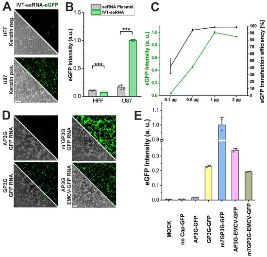 In vitro transcribed seRNA demonstrates high dosability and allows precise modulation. (A) Micrographs and (B) expression intensities of IVT-seRNA-eGFP in HFF non-target cells and U87 target cells. Scale bar 200 µm. n = 3 independent samples. p-values were calculated using one-sided ANOVA. (C) IVT-seRNA dose-dependent expression in vitro quantified by eGFP intensity and transfection efficiency in U87 cells. n = 3 independent samples. (D) Micrographs of U87 cells transfected with unselective eGFP mRNAs comprising different 5′ cap structures and comprising the EMCV IRES element in combination with AP3G cap structure presented in conjunction with respective eGFP intensity (E). n = at least 2 independent samples. Scale bar = 200 µm. p-values of 0.001 are indicated with three *.