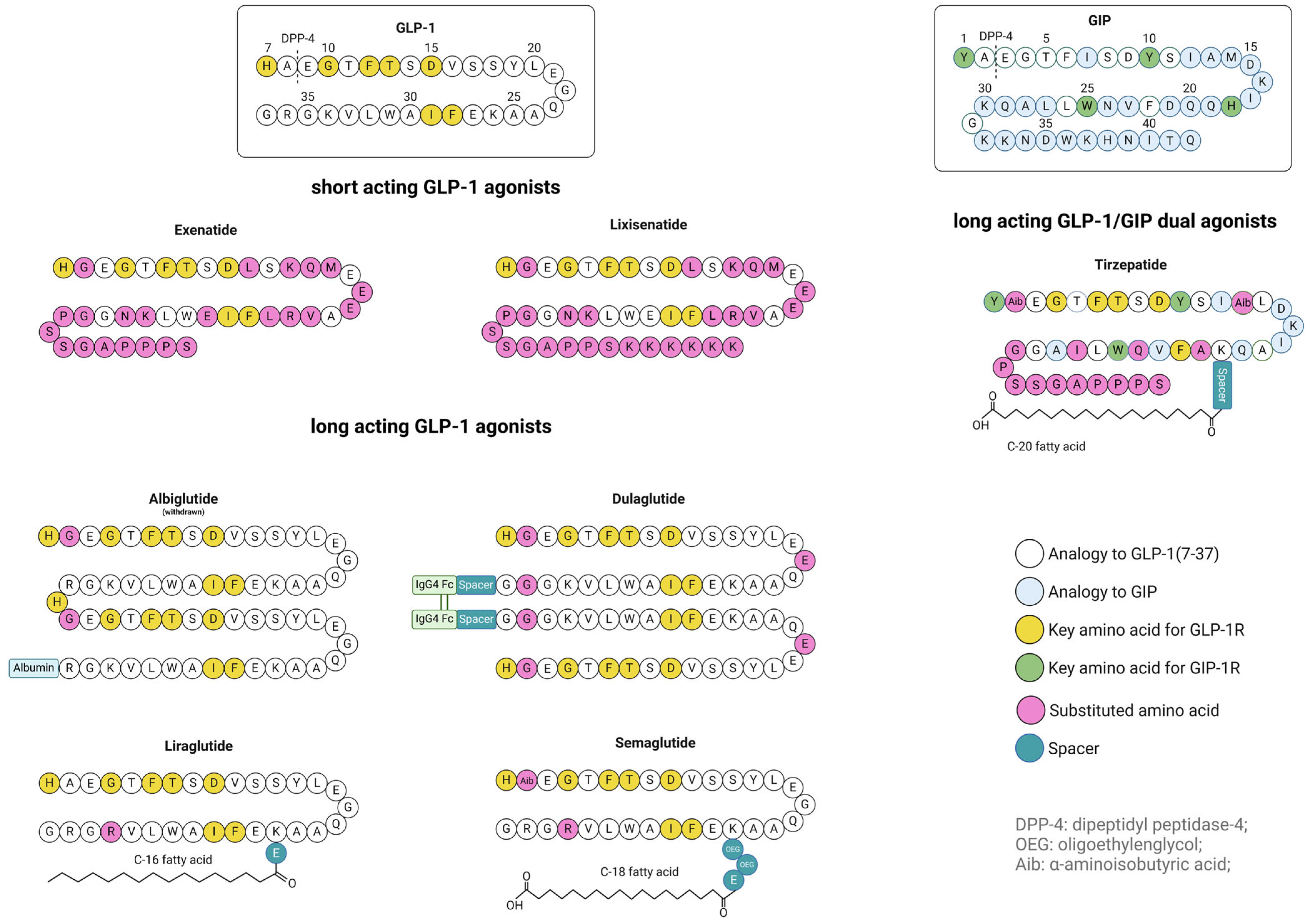 | Tirzepatide | 4813.5 Da | - (1) | Ala8→Aib substitution | Lys26: C20 (via γGlu-Ado-Ado linker) | Mounjaro® 2022 Zepbound® 2022 | ~5 days | s.c.: 2.5/5/7.5/10/12.5/15 mg | [53] |