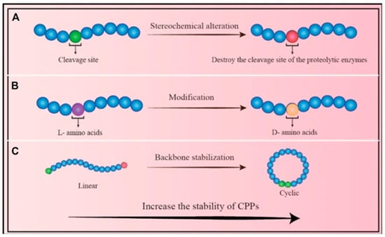 Approaches to Enhance CPP Stability: (A) Stereochemical modification: Altering the chemical configuration of amino acid residues reduces the enzymatic susceptibility of CPPs. (B) Amino acid substitution: Replacing natural residues with alternative isomers can significantly improve CPP stability. (C) Backbone cyclization: Converting linear CPPs into cyclic forms enhances resistance to enzymatic degradation and increases overall structural stability [49].