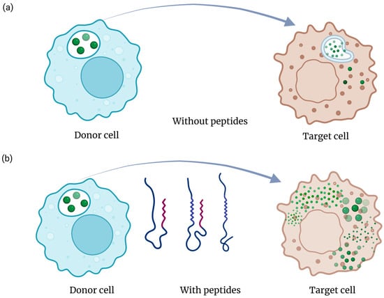 Sematic representation of endosomal escape in the absence (a) and presence (b) of peptide sequences. Peptides can enhance the efficacy of CMDS by enhancing the endosomal escape of cargo molecules.