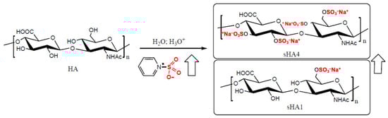 With the aim of mimicking the structural and functional properties of natural sulfated GAGs, sulfated hyaluronic acid (sHA) has been developed as a derivative of HA through the sulfation of one or more hydroxyl groups of the repeating disaccharide unit. This chemical modification substantially increases the negative charge density of the polymer and improves its water solubility. According to published methods, sHA can be synthesized by reacting the tetrabutylammonium salt of HA with a sulfating agent (e.g., SO3–pyridine complex) in an acidic organic environment [42] or directly from the sodium salt of HA in acidic aqueous conditions [43]. The degree of sulfation (DS) can be precisely controlled by varying the molar ratio of the sulfating reagent. The resulting product is typically purified by ethanol precipitation or dialysis followed by lyophilization [10].