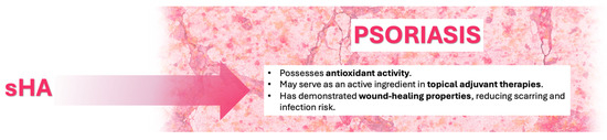 Oxidative stress is well described as one of the major causes of psoriasis pathogenesis [44,79]. sHA polymers, thanks to their antioxidant activity [80], could be considered as active ingredients in a topical formulation for the adjuvant therapy of psoriasis; moreover, sHA has been used as a wound healing agent due to its ability to support the physiological healing process by reducing the risk of scarring and infection [81] (Figure 3).