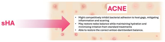 Finally, as observed in psoriasis and atopic dermatitis, oxidative stress contributes to acne pathogenesis [93]; thus, low-sulfated HA may also restore redox balance while maintaining hydration and minimizing irritation from standard treatments, and sHA administration could restore the correct antioxidant/oxidant balance (Figure 4).
