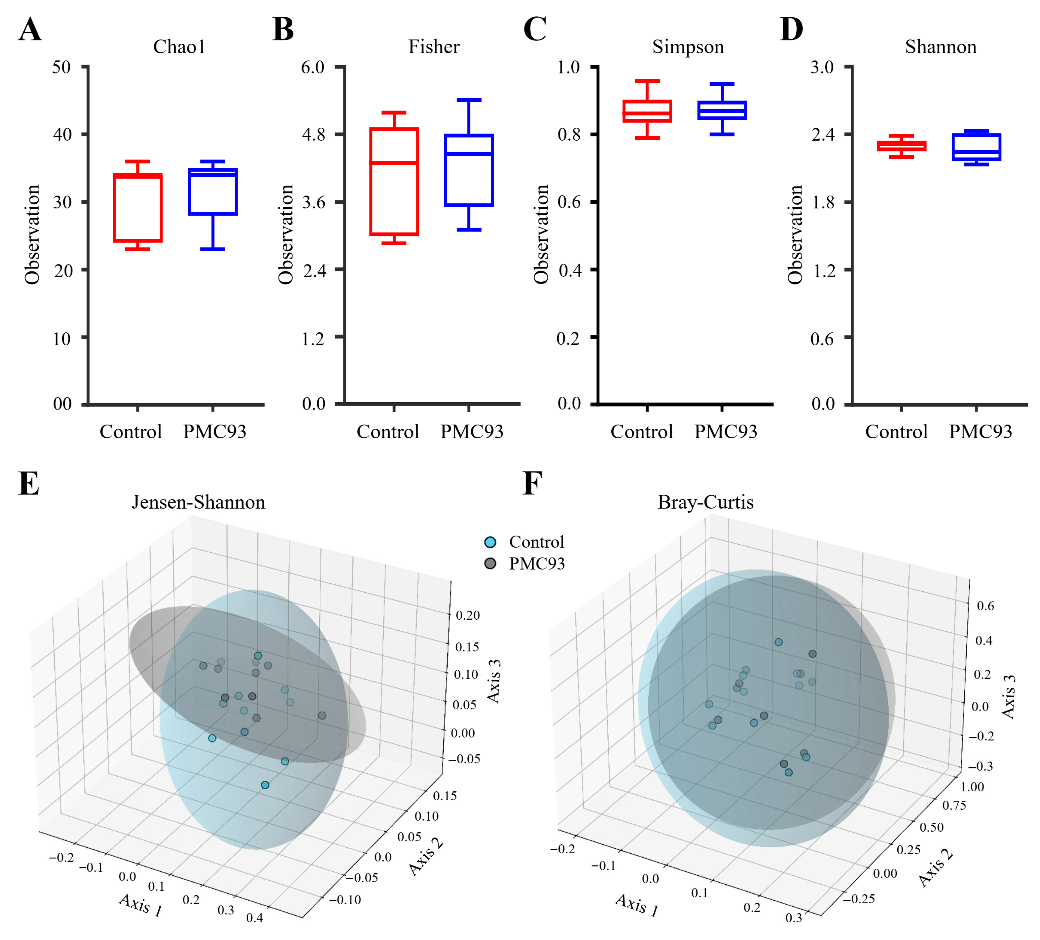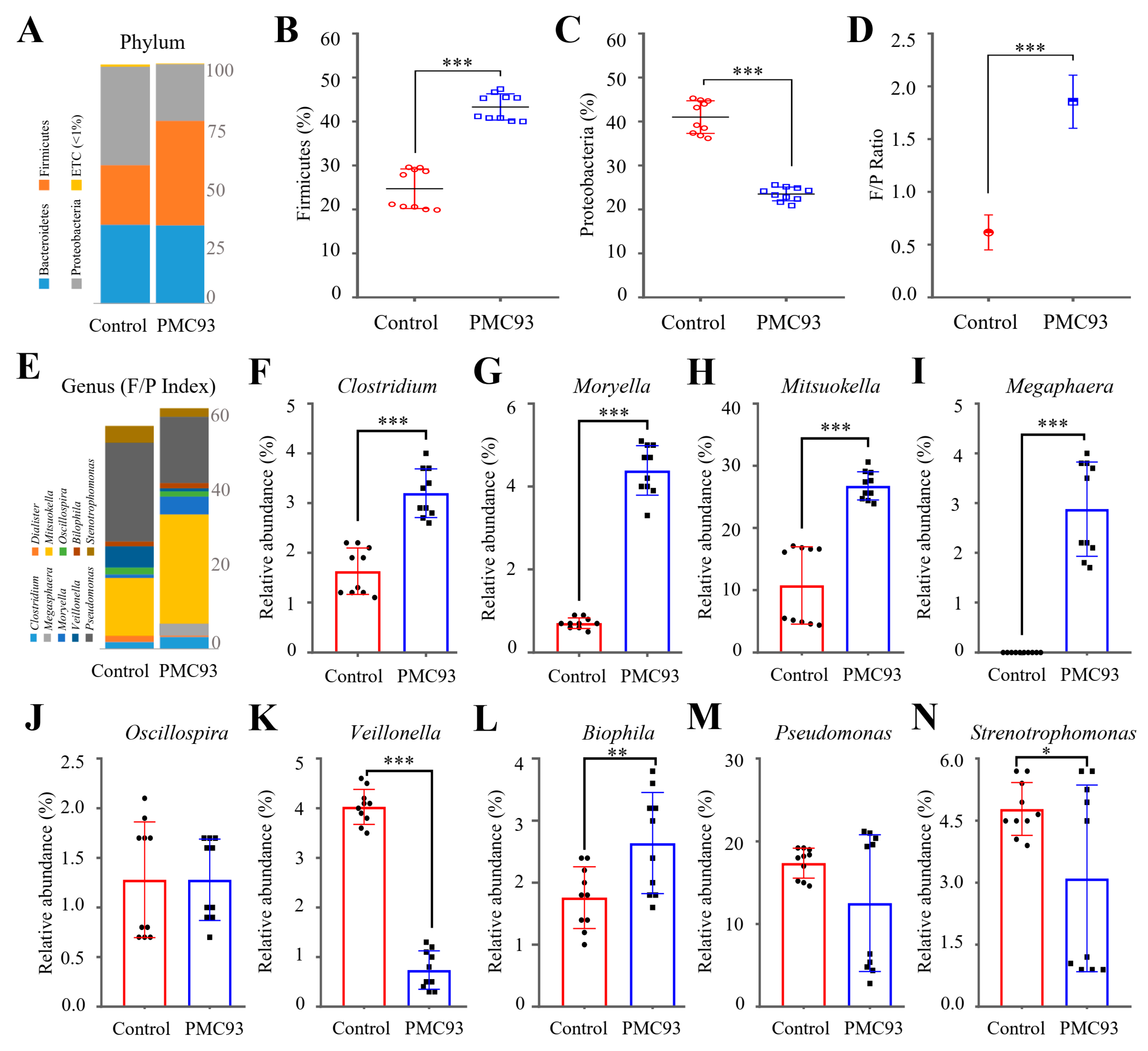 | Phylum | Control | PMC93 | Class | Control | PMC93 | Order | Control | PMC93 | Family | Control | PMC93 | Genus | Control | PMC93 |
