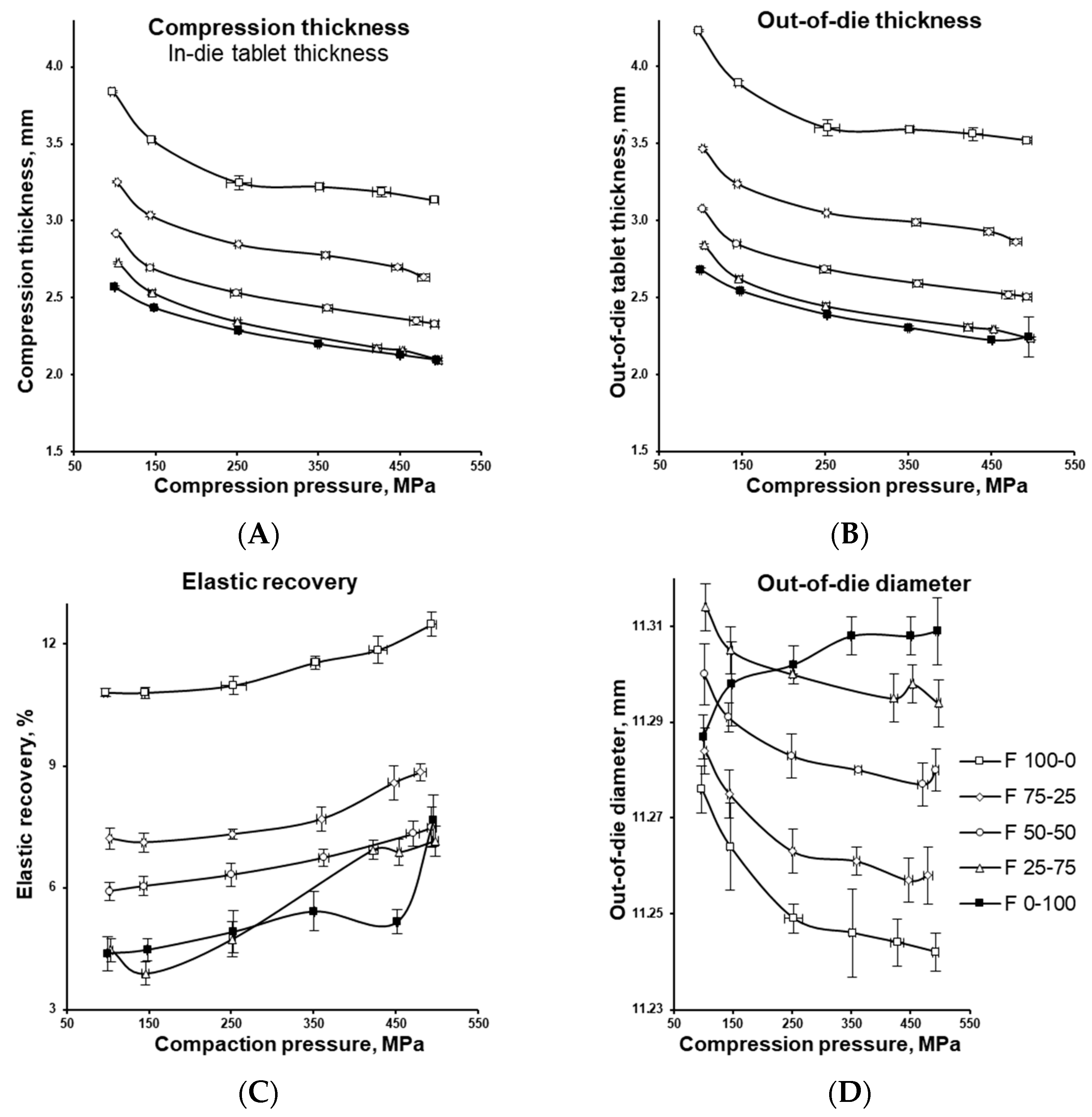 - Schönfeld, B.V.; Westedt, U.; Wagner, K.G. Compression Modulus and Apparent Density of Polymeric Excipients during Compression-Impact on Tabletability. Pharmaceutics 2022, 14, 913. [Google Scholar] [CrossRef]