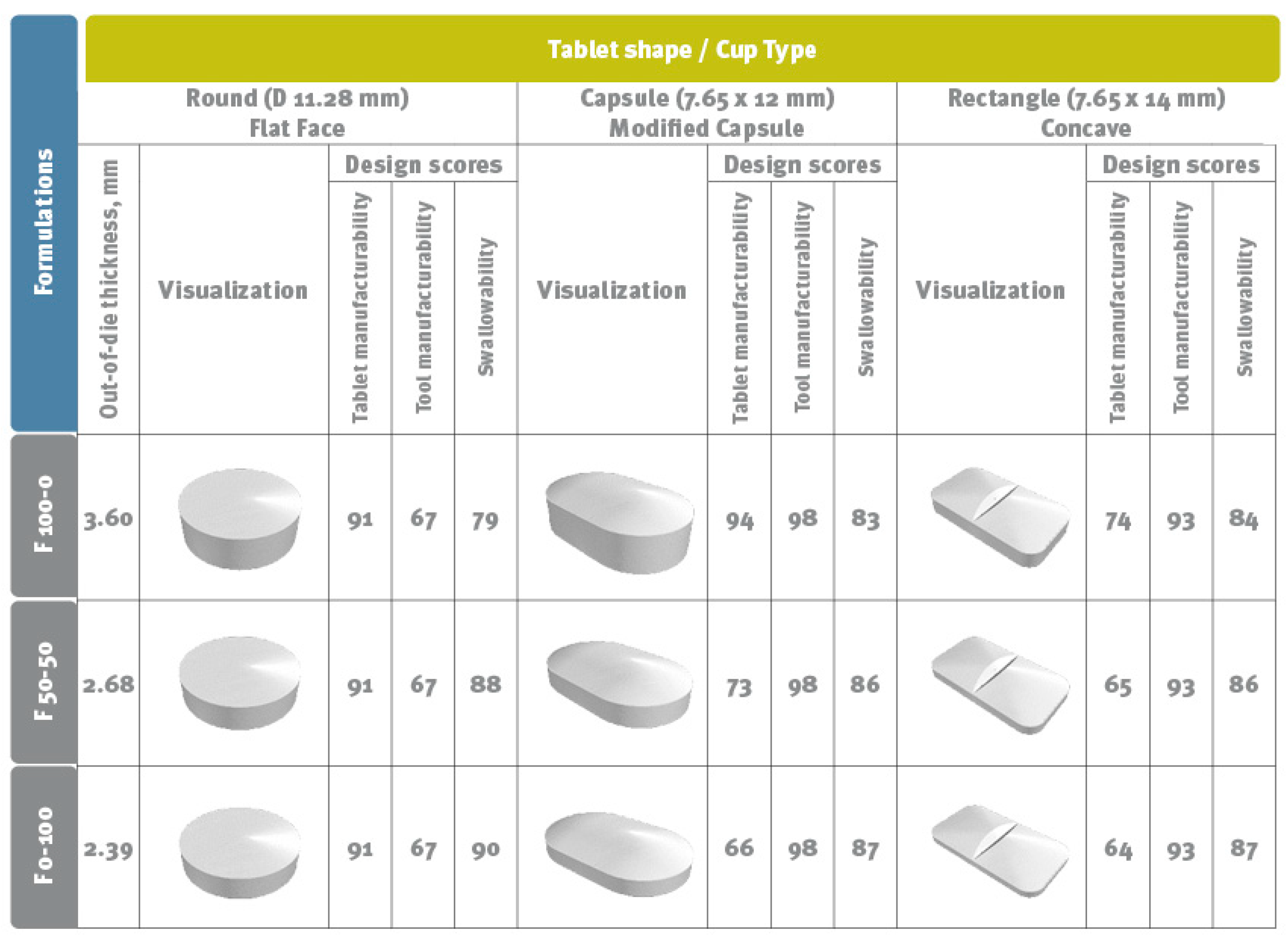 2.9. Visualisation of Tablet Size and Shape