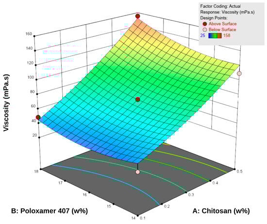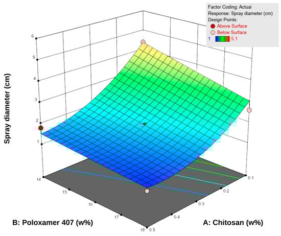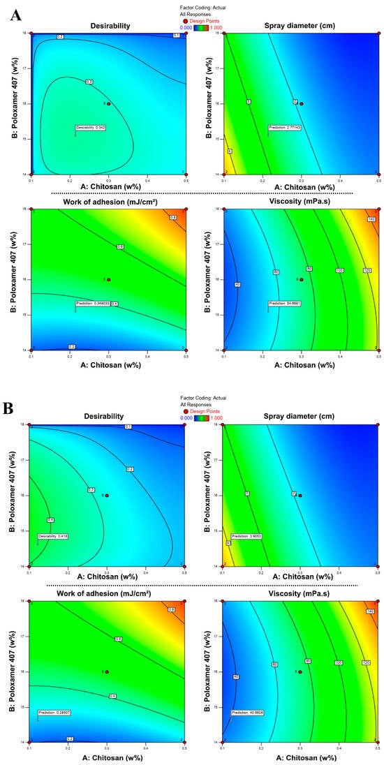 Optimization of chitosan- and P407-based spray-gel formulations was performed using Design-Expert software (Version 22.0.3, Stat-Ease Inc., Minneapolis, MN, USA). The optimization study was conducted within the framework of the Quality by Design (QbD) approach using RSM. P407 and chitosan concentrations were selected as independent variables, with the minimum and maximum levels set at 14–18% for P407 and 0.1–0.5% for chitosan (