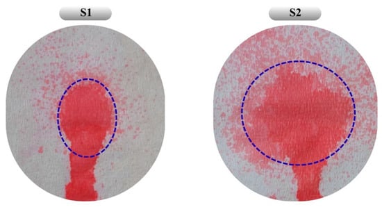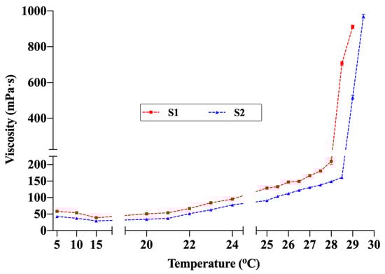 Figure 7) revealed that viscosity remained low and stable between 5 °C and 20 °C. Maintaining fluidity within this range provides a significant advantage for spray application. The fact that the viscosity did not reach levels that would hinder spraying even at room temperature (≈22–25 °C) indicates that the formulations can maintain sprayability under typical use conditions. Viscosity began to increase gradually around 24 °C and rose sharply between 28 °C and 30 °C, marking the sol–gel transition. Under the measurement conditions (SC21 spindle, 50 rpm), the maximum measurable viscosity was 1000 mPa·s; thus, the final measurement was recorded at 29 °C for S1 and 29.5 °C for S2. These rheological findings, supported by visual observation, confirmed complete gelation. The slightly lower T