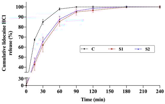 The release profiles of the thermosensitive spray gels (S1 and S2) were compared with an aqueous solution containing the same amount of active ingredient. In both formulations, lidocaine release increased markedly during the first 60–90 min and then reached a plateau, with cumulative release values stabilizing at approximately 95–100% around 120 min (