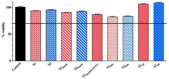 Figure 9. Despite slight variations in chitosan and P407 levels, all S1 and S2 formulation pairs showed comparable cell viability, with no significant differences detected (