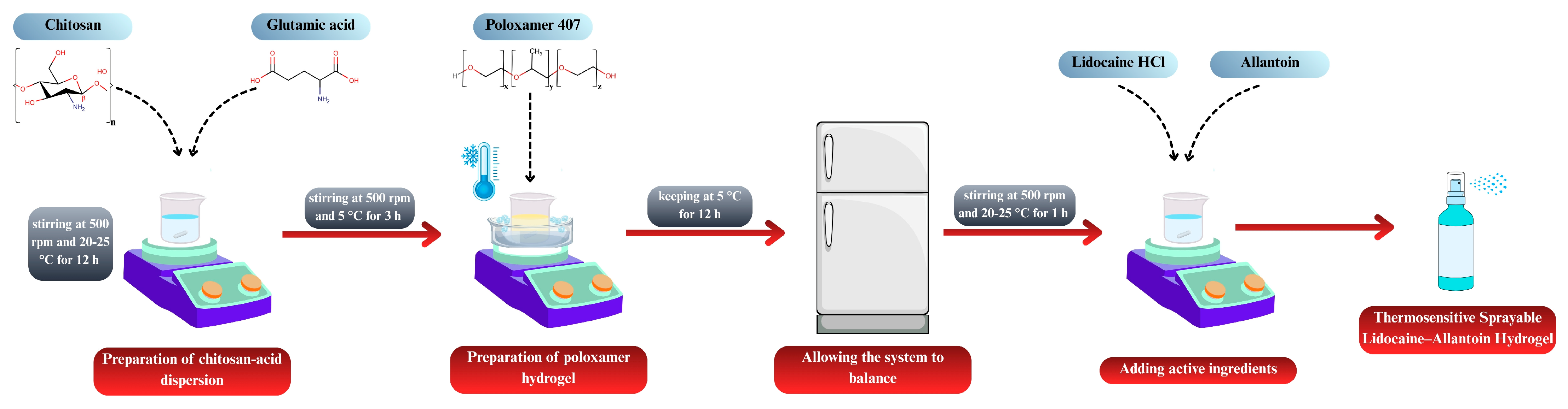 Lidocaine hydrochloride (Suvar Kimya, İstanbul, Türkiye), allantoin (Doğa İlaç, İstanbul, Türkiye), P407 (BASF, Ludwigshafen, Germany), chitosan (BBI Life Sciences, Shanghai, China), 3-(4,5-dimethylthiazol-2-yl)-2,5-diphenyltetrazolium bromide (MTT) and glutamic acid (Sigma-Aldrich, St. Louis, MO, USA), and acetonitrile (Merck, Darmstadt, Germany) were used. P407 was kindly provided as a gift by BASF. Reagents used for cell culture were purchased from Gibco (Paisley, UK). The TNF-α assay kit was purchased from Elabscience (Houston, TX, USA). The human keratinocyte cell line (HaCaT) was obtained from the American Type Culture Collection (ATCC, Rockville, MD, USA). All chemicals were of pharmaceutical grade and used without additional purification.