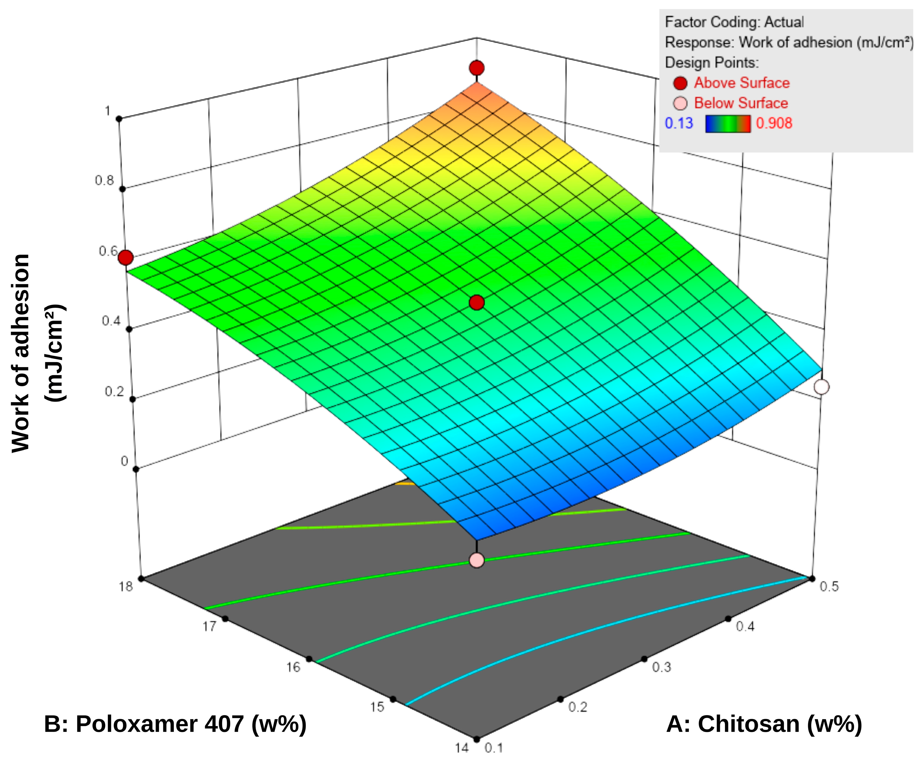Table 2). Spray pattern diameter, work of adhesion, and viscosity were defined as response parameters to evaluate the effect of formulation variables. Response surface plots were constructed using the experimental results, and the optimal formulation was identified from the model-predicted target responses.