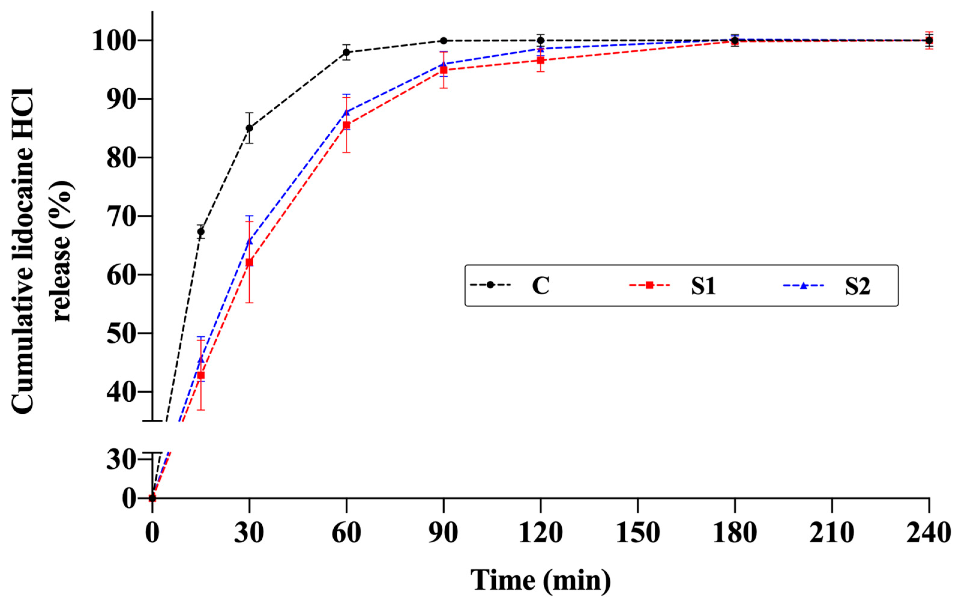 For the lidocaine control solution, the highest release rate was observed in the early phase due to the absence of a polymeric gel structure. In formulation S2, the lower viscosity resulting from lower P407 and chitosan concentrations facilitated faster diffusion, leading to higher release within the first 60 min compared to formulation S1. In formulation S1, the higher total polymer content formed a denser network, partially limiting early-phase diffusion but not affecting the final cumulative release, which reached values similar to the control at 120 min.