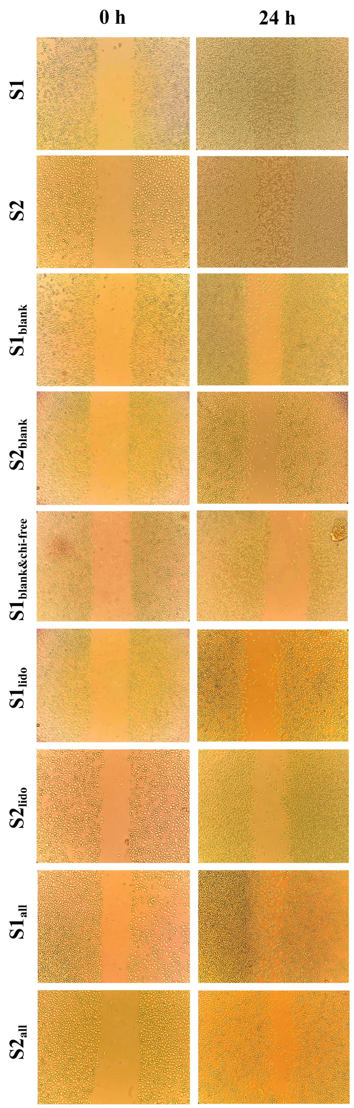 lido) exhibited slower closure rates, with partial recovery of the wound area at 24 h. This finding suggests that lidocaine alone provides limited regenerative support under the experimental conditions, as its primary contribution is anti-inflammatory rather than proliferative. Interestingly, the blank formulations containing chitosan glutamate (S1