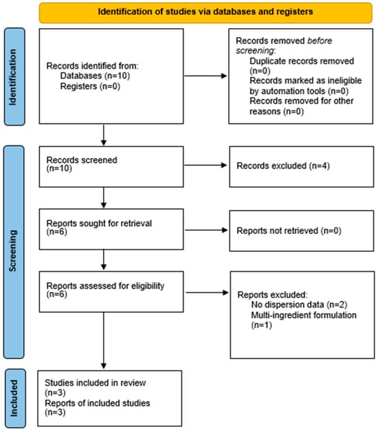 - Excluded: 3 (reasons: no dispersion data [2]; multi-ingredient formulation [1])