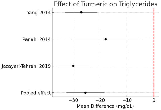 Across three RCTs (n ≈ 190), turmeric supplementation significantly reduced TG by −25.5 mg/dL (95% CI −32.5 to −18.4, I2 = 0%). Figure 2.