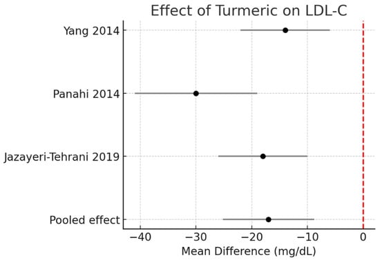 Meta-analysis of turmeric interventions vs. placebo on total LDL-C (mg/dL) [30,31,32].