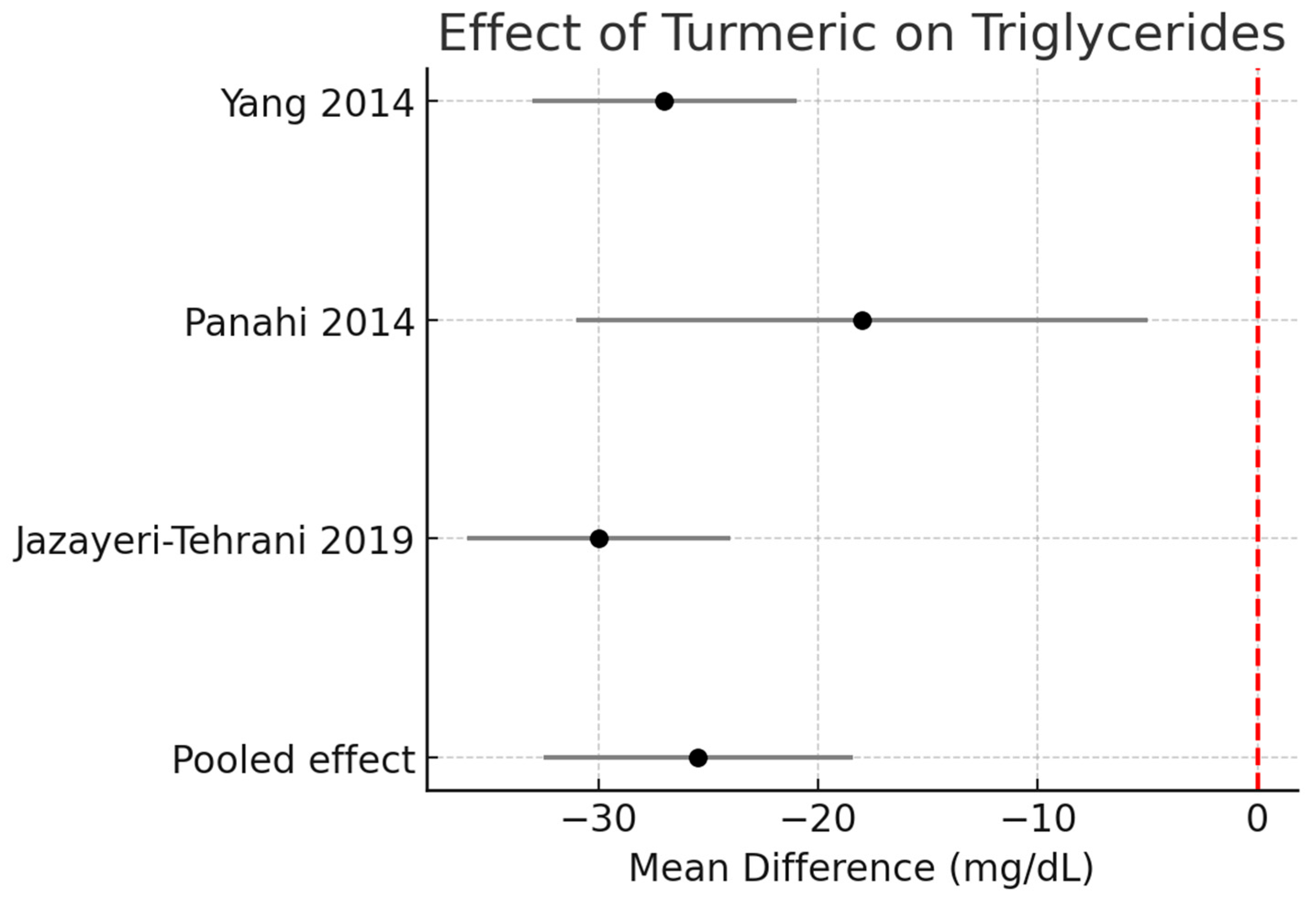 | TG | Turmeric + piperine | 1 | −18.1 | −31.0 to −5.3 | – |
