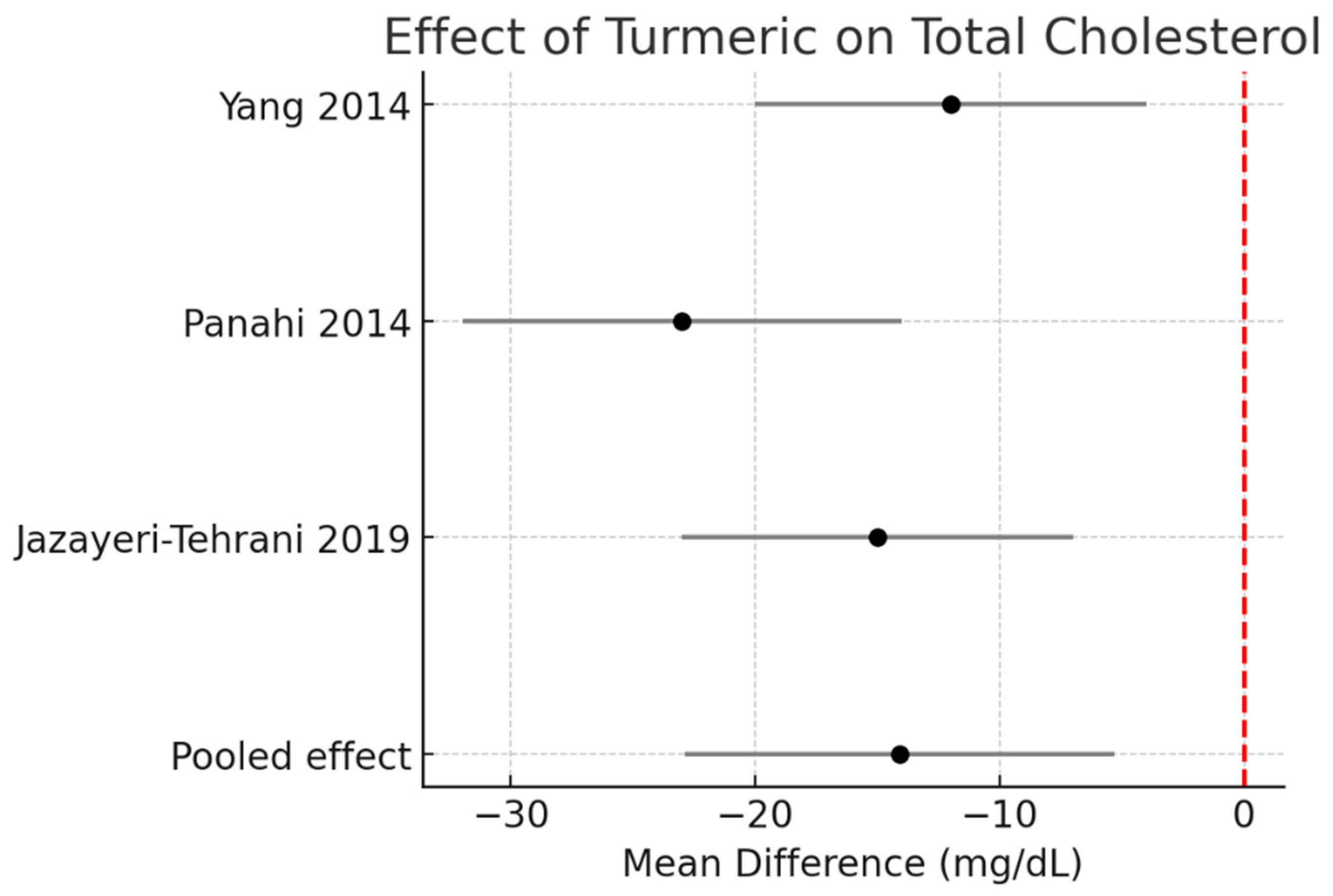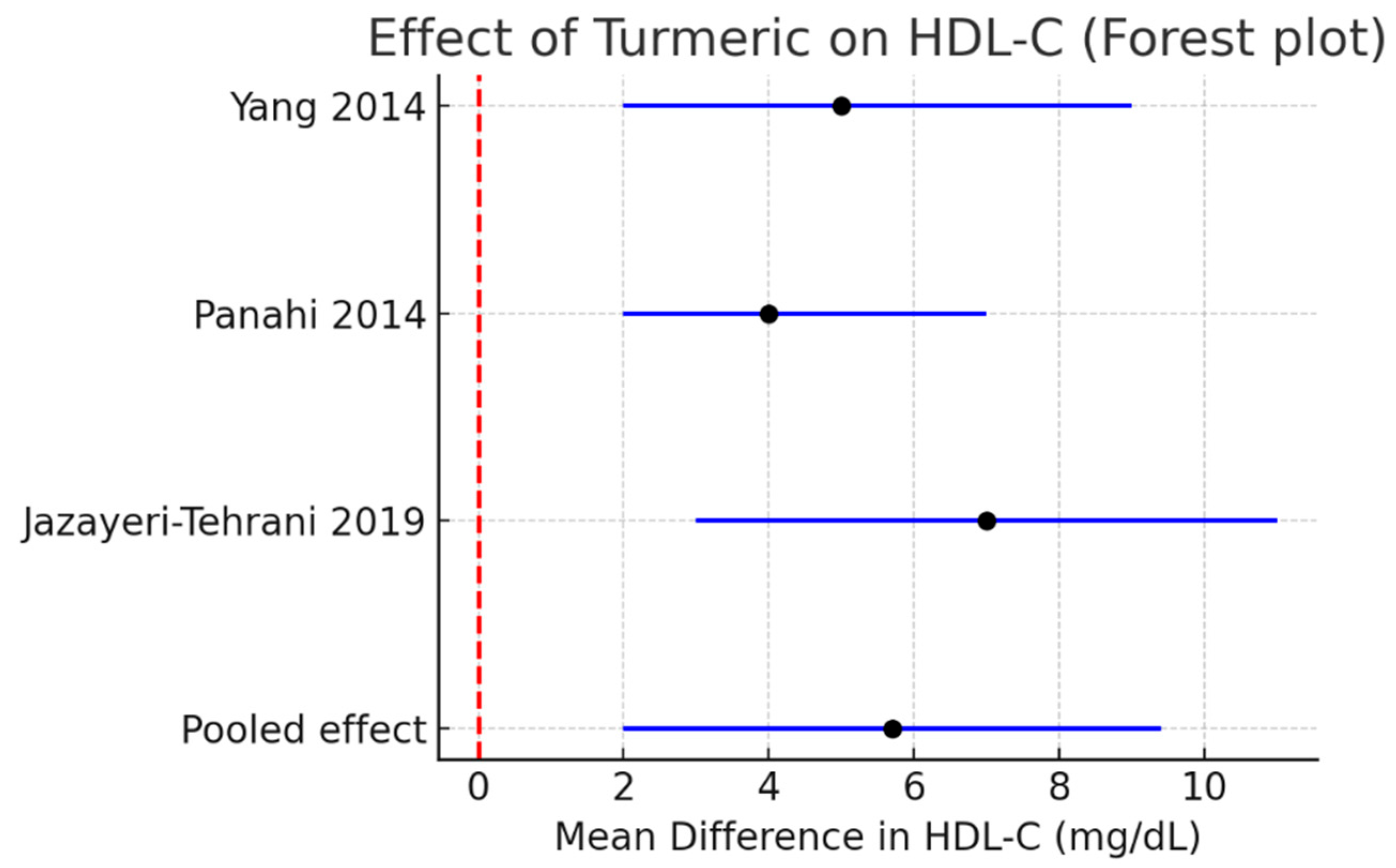 | HDL-C | Turmeric + piperine | 1 | +4.3 | +1.5 to +7.0 | – |