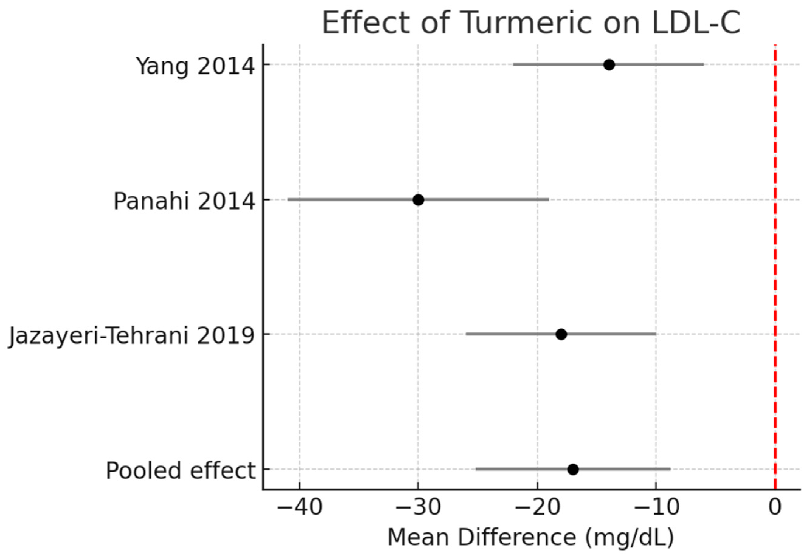 | LDL-C | Turmeric alone | 2 | −16.2 | −25.0 to −7.4 | 0 |