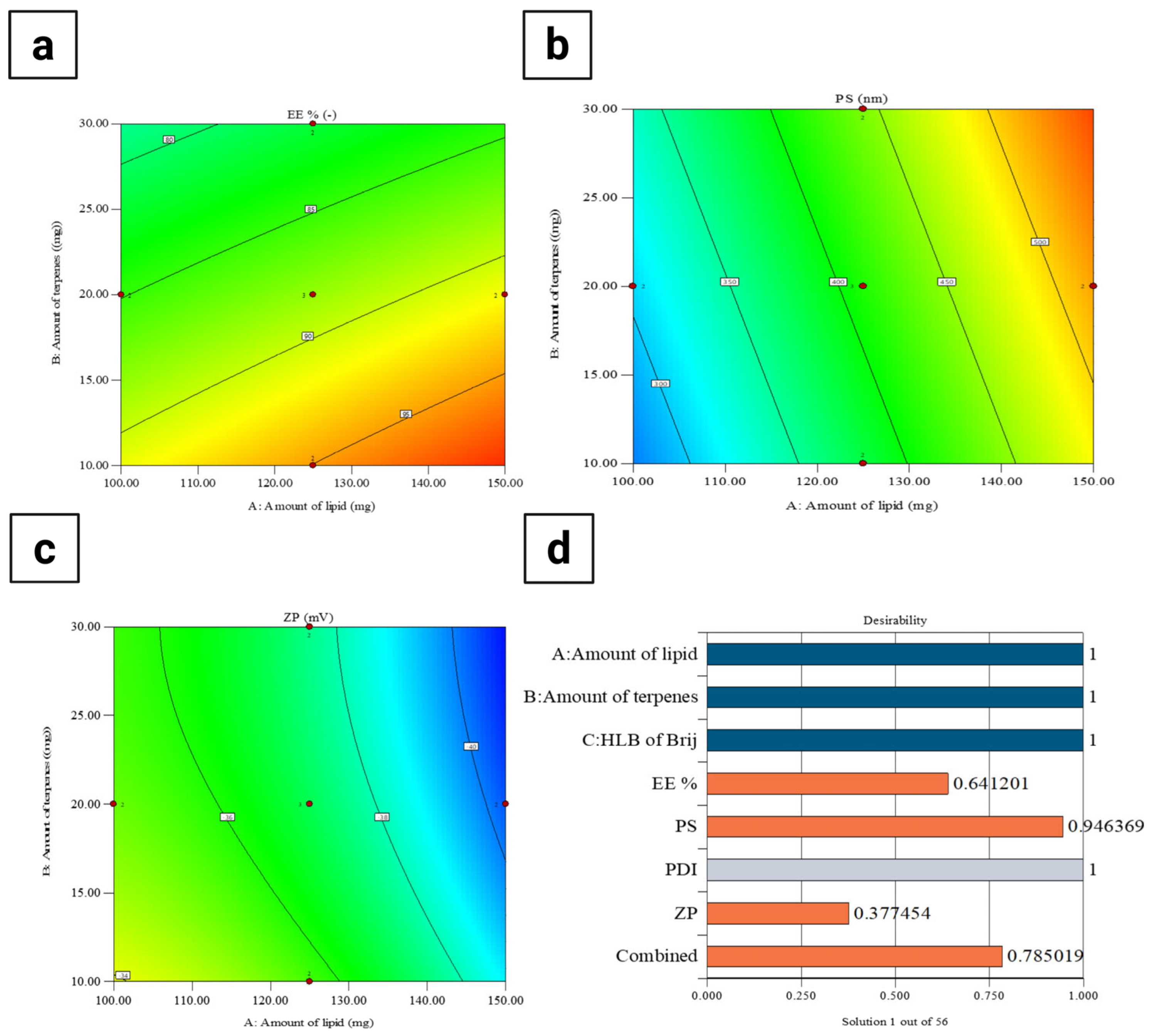 | Formula Code | Lipid Amount (mg) | Terpene Amount (mg) | HLB of Brij® | EE (%) | PS (nm) | PDI | ZP (mV) |