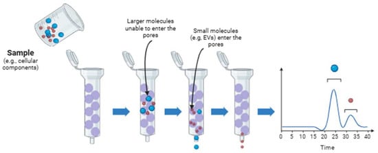 Size exclusion chromatography (SEC) is a proven technique primarily applied to macromolecules, such as proteins, due to its ability to preserve EV integrity and functionality. This technique selects components based on their molecular size or hydrodynamic volume. According to the components of chromatography, the system involves a stationary phase, porous in this case, which can be coupled or not to a pump. A scheme of this technique is shown in Figure 2. One of the main features of SEC is its capability to solve a wide variety of samples from different origins, including eukaryotes and prokaryotes. However, the main difference between these EVs produced by these cells is based on their lipid membrane composition, membrane proteins, and cargo, but they share a range of sizes. Therefore, it is important to note that this technique can be applied to both, but it cannot distinguish between different cell origins of EVs. This technique can isolate EVs from varied samples such as milk, saliva, and synovial fluid. One of the main challenges for SEC isolation capability is when the sample exhibits complex fractionation, contains lipoproteins and proteins, and we are working with diluted samples; therefore, it should be concentrated. The necessity for standardized protocols will help with the problems based on the sample origin. The scalability is another limitation to be considered [163]. To solve some of these drawbacks, urinary sub-populations of exosomes can be separated by applying a two-step SEC. This approach, described as two-dimensional SEC, employs two consecutive SEC columns: the first, with a pore size of 50 nm, retains larger particles and thereby allows the smallest EVs to elute first, while the second column, with 200 nm pores, further resolves the remaining, larger vesicle fractions [164]. The method uses agarose beads as the stationary phase, which are easily adjustable and scalable for different sample types. Bed volume and exclusion limits are selected according to sample requirements; for example, Sepharose® CL-4B with 42 nm pores is preferred over 75 nm pores when separating EVs from proteins such as albumin. Consequently, SEC offers advantages over ultracentrifugation, which is unable to efficiently isolate and separate these components [165,166]. Many columns can be chosen depending on the original material. One of the most versatile columns is the IZON® qEV column, which can be used for cell culture [167], plasma or serum [168], urine [169], saliva and tear fluid [170], milk [171], lymph node and spleen [172]. Sepharose® CL-2B, Sepharose® CL-4B, and Sephacryl® S-400 columns are also used for isolating EVs from cell cultures and from other biological sources [159].