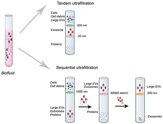 Additionally, membrane blockage decreases its efficiency and reduces the lifetime, which confers another problem due to their high costs. Additional filtration-based approaches are also available. Tangential flow filtration relies on the same fundamental principle and reduces this drawback. In this method, the flow is parallel (tangential) to the membrane surface rather than perpendicular, as occurs in centrifugal ultrafiltration. As a result, molecules smaller than the membrane pore are discarded, and bigger such as EVs, remain on the membrane and are subsequently collected with a previous concentration by recirculation. This technique gains importance for diluted samples [175]. Sequential ultrafiltration (SU) is another similar technique that involves a three-step filtration procedure. First, debris, second, proteins, and last, EVs are separated [176]. For exosomes isolation and separation, SU employs hydrophilic polyvinylidene fluoride membranes with progressively decreasing pore sizes from 0.65 to 0.1 μm. This technique can be combined with filtration (macrofiltration, of bigger vesicles such as apoptotic bodies), but it must be considered that the limitations of including this technique as an intermediate phase [177].