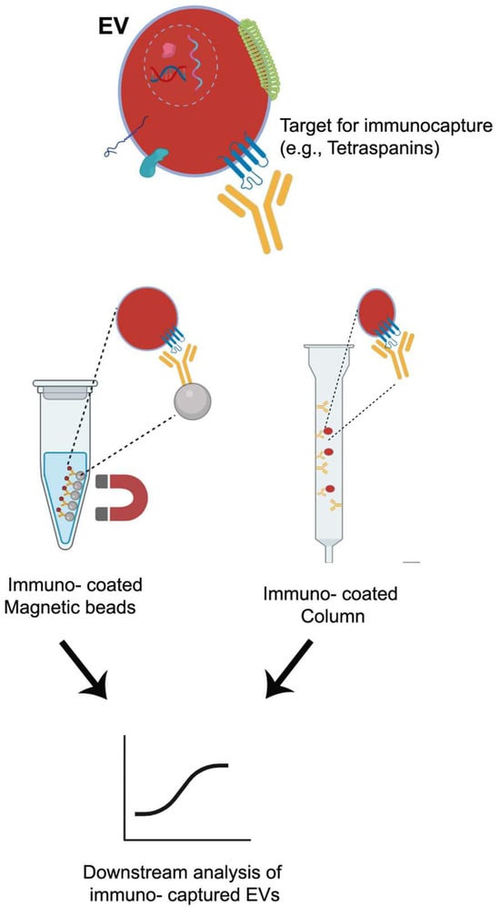 Affinity-based techniques are one of the most commonly used for isolation and separation of EVs. They utilize highly selective and specific interactions between ligands, mainly proteins, or receptors on the surface of EV membranes and their corresponding ligands, such as antibodies [159]. To carry out this technique, the ligands must be immobilized or conjugated onto a solid medium. A scheme is shown in Figure 4. For this aim, solids support as magnetic beads, polymeric materials, or polysaccharides such as agarose, are used. These media are distributed or packed in a column. Affinity-based isolation techniques are broadly divided into two categories—affinity chromatography and immunocapture—based on their distinct isolation mechanisms. Immunoaffinity capture (or immunocapture) is the predominant affinity-based technique for EV isolation. It employs antibodies coupled covalently to magnetic beads, designed to bind to specific proteins present on the EV membrane. As previously mentioned, tetraspanins CD9, CD63, and CD81 are the main biomarkers on the surface of EXs working as antibody targets. Immunoaffinity is advantageous in facilitating the selective isolation of EVs from different healthy and cancerous cells. Several cancer cells from lungs, stomach, and hormone-dependent tissues overexpress the glycoprotein CD326, the epithelial cell adhesion molecule (EpCAM). Thus, anti-EpCAM conjugated magnetic beads were used to isolate EXs from cancerous origin cells. This strategy has been used for the isolation and separation of tumor-derived EXs from healthy cell-derived EXs of plasma [178]. There are many antibodies proposed for the selective isolation of EVs from different tissues. The anti-A33 [179], anti-CD171 [180], anti-CD105 [181], and anti-CD41 from colon epithelial, neuron-derived, endothelial cell, and platelet-derived [173], respectively. For these reasons, this technique exhibits higher specificity and yield compared with filtration techniques. However, “biased” isolation is a frequent drawback of this method. EXs expressing a particular biomarker are detained by the column, but others will pass through. It is known that surface heterogeneity (CD9+ vs. CD9−) is most likely a reflection of deep functional heterogeneity. If a study uses only anti-CD9 to isolate exosomes and then reports a function, it is reporting the function of that specific subpopulation (CD9+), which may be only part of the whole story [182].