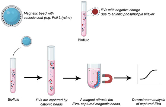 These techniques, such as ionic-exchange chromatography and metal-affinity, are based on ion-exchange because the procedures imply an interaction between the negative surface charge of vesicles, which is mainly given by phospholipids, and a positively charged anion exchanger. Once bonded with the support, EVs are released by the use of high salt concentration solutions, as eluent or mobile phase, which increases the ionic strength of the media (Figure 5). The main difference between the two techniques involves the retention of the EVs. In ionic-exchange chromatography, the retention is produced by resins, and in the metal-affinity technique, by metal or magnetic beads, which are removed along with bonded EVs by a magnet. The columns used in this type of chromatography can show a strong anion exchanger, such as a monolithic column with quaternary amine functionality, or a weak anion exchanger, such as a diethylaminoethyl cellulose resin. This technique has been applied to the isolation of mesenchymal stem cell-derived EVs [185], amniotic fluid [186], and cell cultures such as HEK293T cells (kidney embryonic cells) [187]. However, the applications of Anion exchange chromatography as a single isolation technique are limited to cell cultures despite its versatility and scalability. Kosanović et al. have reported the application of this technique for the isolation of EVs combined with ultracentrifugation [186]. This technique shows several limitations when samples show a high amount of charged molecules, such as proteins. For that reason, samples of blood or derived from blood sometimes will need a complementary method to improve the purity.
