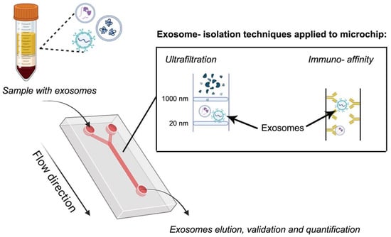This is an emerging technique that allows the control and manipulation of small volumes of fluids, typically ranging from nanoliters to microliters, within microscale networks of channels excavated by a laser [191]. In this context, microfluidic devices have been used for EXs separation because they show advantages such as reduced volumes of sample (and buffer) due to the miniaturization, the option to have the device custom-built, and high throughput capability [192]. These devices show the additional advantages of microscale, such as improved thermal transport, low contamination risks, minimized time-dependent degradation reactions by reducing the separation or analysis time, and others. Therefore, this technology, allows a rapid and efficient isolation and detection of EVs from complex biological samples. This is an advantage over other techniques such as SEC. Therefore, it streamlines the process, shortening the analysis periods of a large number of samples and improving high-throughput screening [193]. Microfluidic devices were first thought with capillary systems for electrophoresis, but nowadays are based on a chip format. Separation of EXs can be boosted by the immobilization of ligands (affinity-based methods), mainly antibodies or proteins, on the channel walls or compartments of the device or by incorporating membrane filtration, such as nanoporous membranes [194] (Figure 6). Affinity-based isolation methods coupled with a microfluidic device can be automated for sample processing, avoiding expensive and complex devices. An affinity-based microfluidic device functionalized with antibodies of membrane biomarkers CD9 and EpCAM, which was used for small EXs isolation from high-grade serous ovarian cancer serum [195]. A microfluidic device based on membrane filtration was developed by Zhao et al. [196] for automatic isolation and enrichment of EXs formed by two membranes. The first one removes large-sized particles and blood cells, while the second, positively charged, retains the EXs by complementary charge. This approach reached a 99.8% protein impurity removal and isolated more than 80% of EXs from the samples. Therefore, the adaptation of membranes to these devices enables the separation of EXs from different origins such as human plasma, bronchoalveolar fluid, and urinary fluid [197].