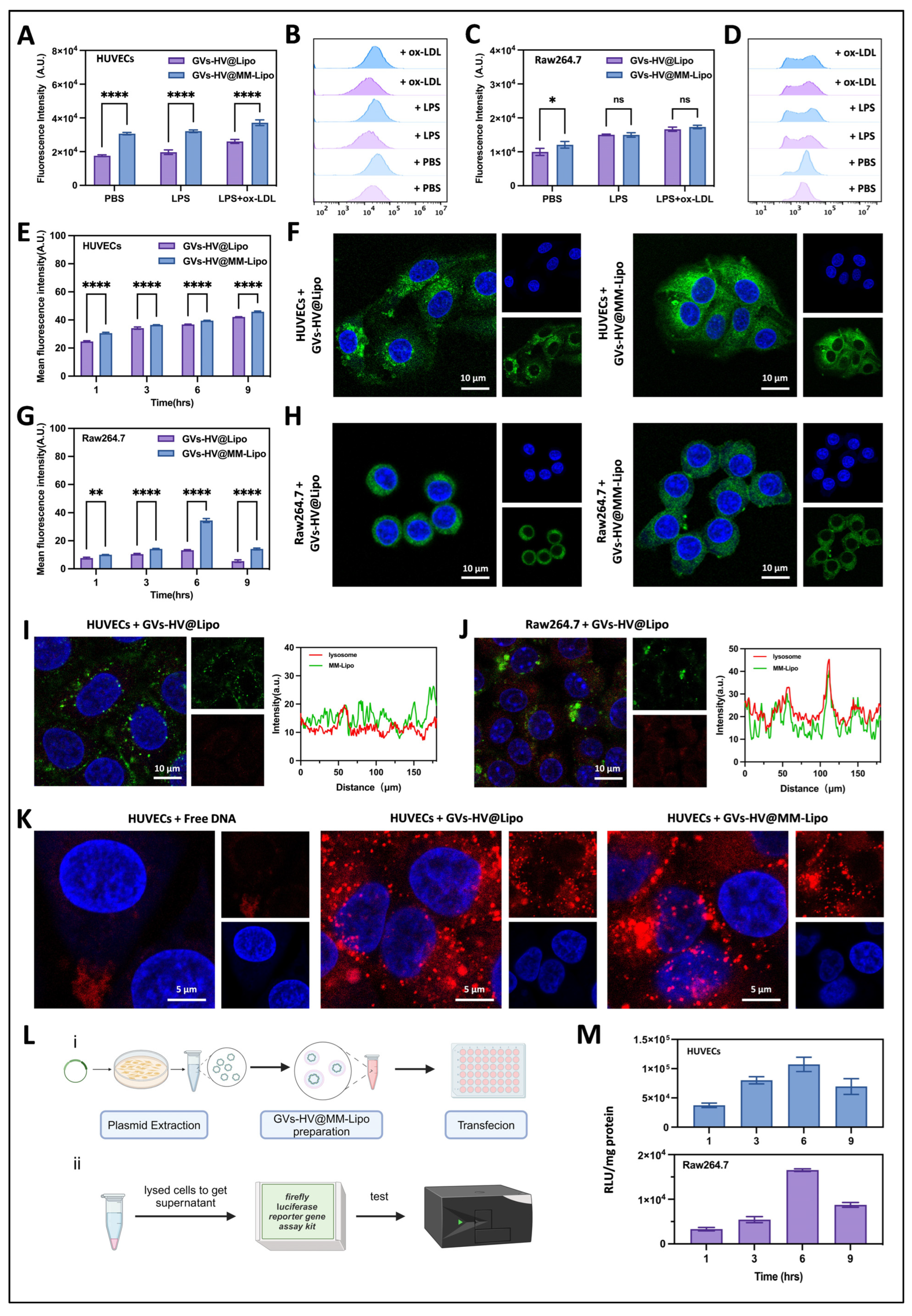 3.3. Uptake and Intracellular Transport of GVs-HV@MM-Lipo