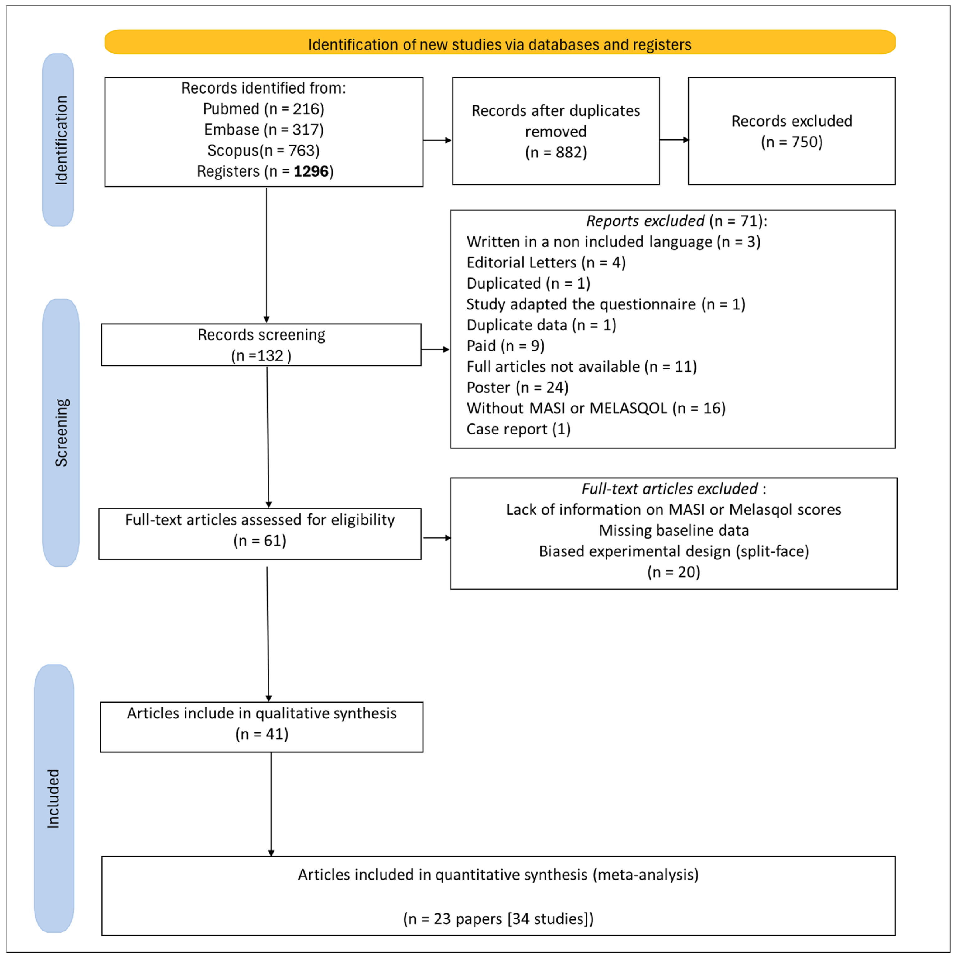 | Cestari et al. [12] Brazil | F (135) M (4) 42.5 ± 7.5 | 13.3 ± 6.7 | 4.1 ± 3.7 | 44.4 ± 14.9 | 24.3 ± 15.5 | Pearson’s correlation between MASI and MELASQOL was positive correlated. | ||