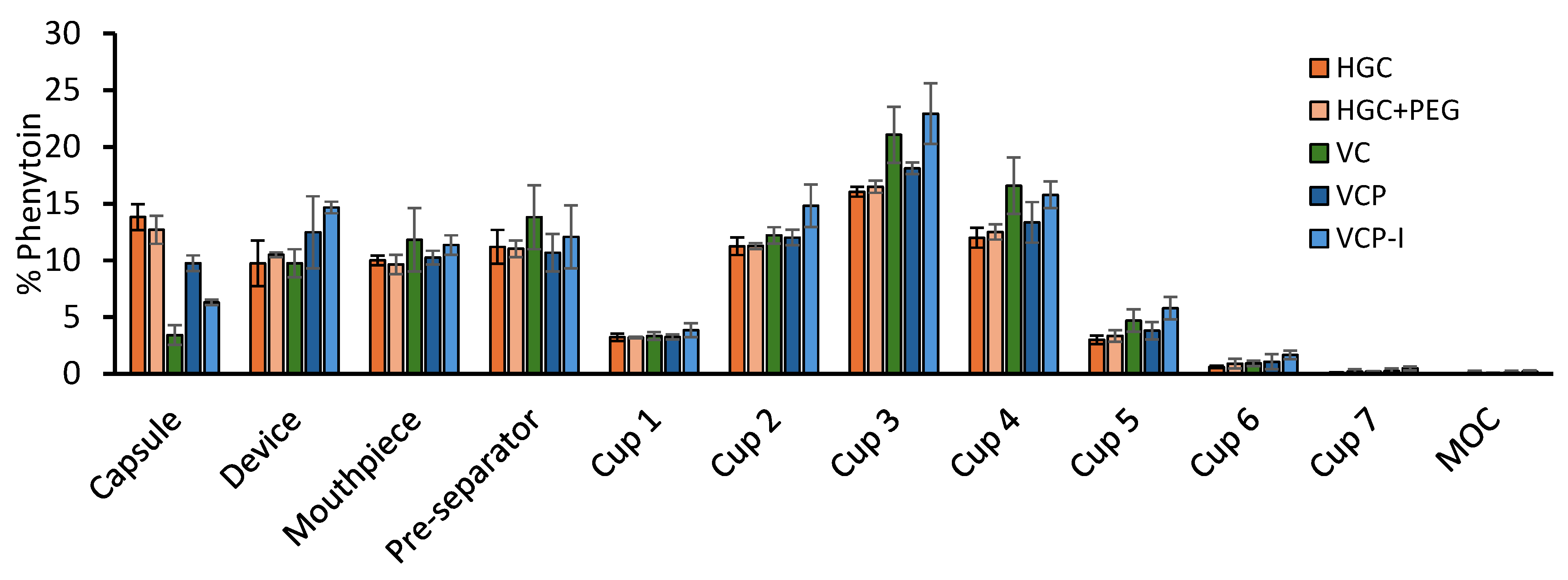 Concerning the FPF, no influence of the capsules was observed. This result was expected as FPF corresponds to the fraction of phenytoin from the ED with particle size below 5 µm, and therefore only takes into account what is released from the cDPI. The similarity between FPF values obtained for all capsule types highlights the robustness of the formulation, which aerosolized similarly in the NGI apparatus with a final FPF between 51% and 57%.