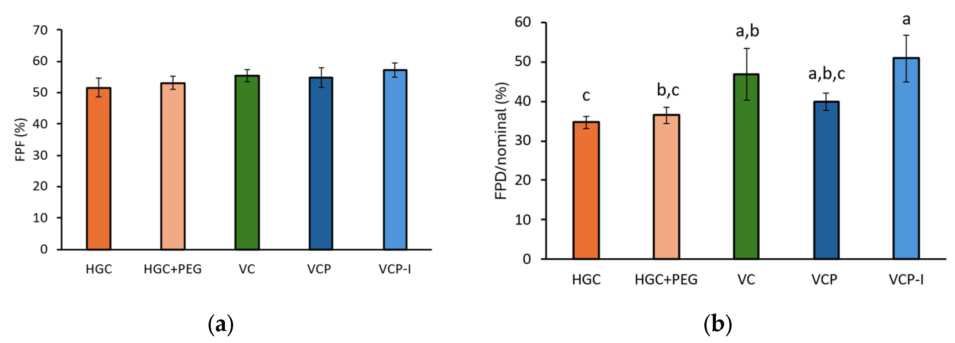 Capsule retention has a direct impact on EF, corresponding to the fraction of dose released from the capsule and device, for which higher values were obtained with VC followed by VCP-I, VCP, and then both gelatin-based capsules.