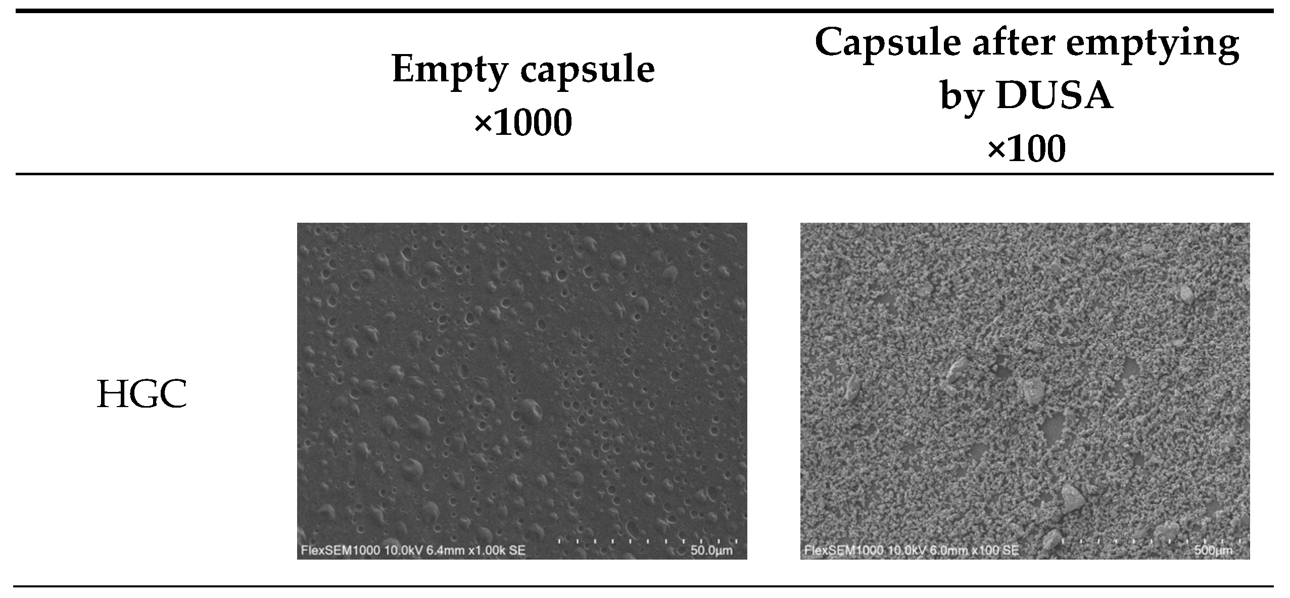 The current study primarily relied on morphological observations and basic surface measurements. Advanced characterization techniques such as X-ray photoelectron spectroscopy, Dynamic Vapor Sorption analysis, atomic force microscopy, and inverse gas chromatography could provide deeper insights into surface chemistry and energetics relevant to powder–capsule interactions.