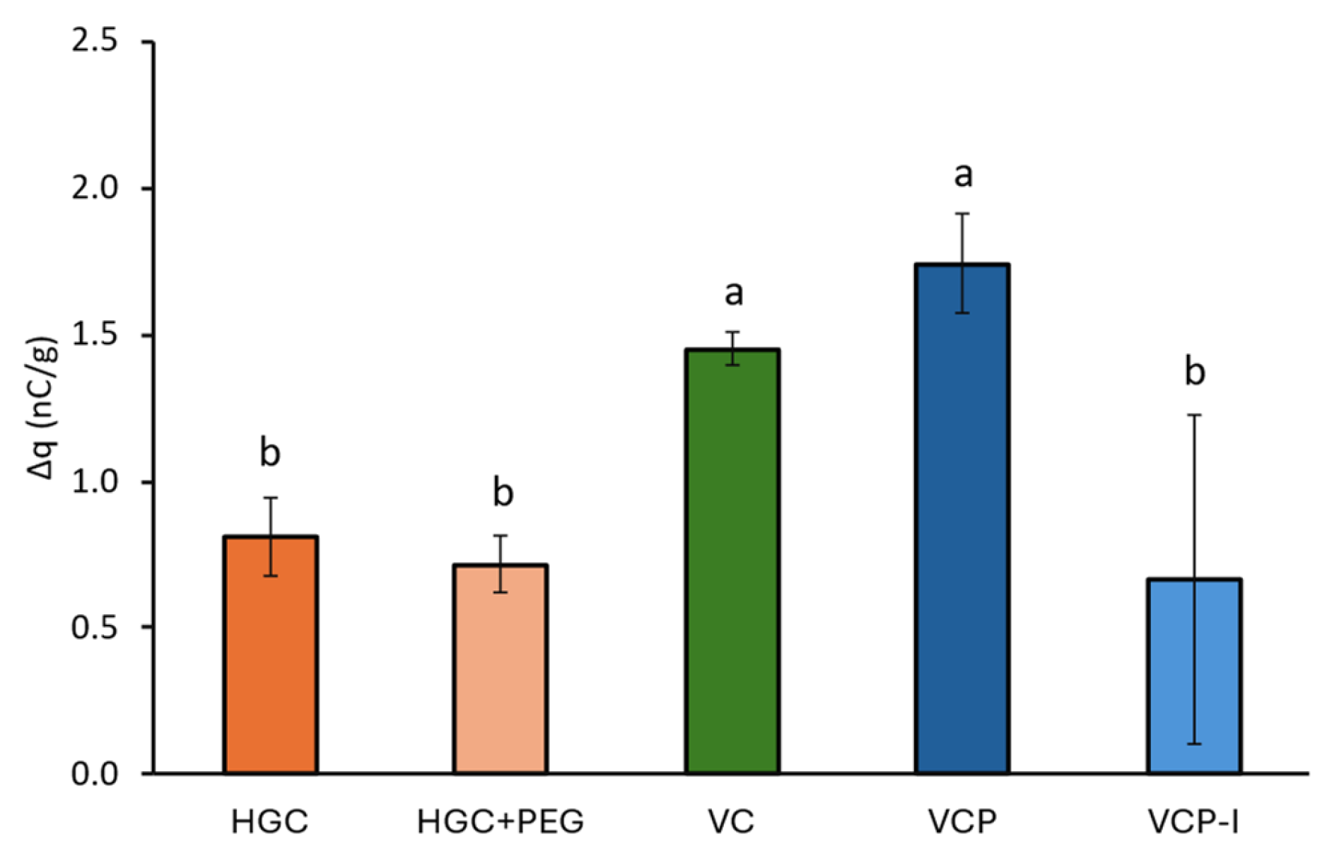® device. The measured density of charges were all positives, below 2 nC/g for all capsule types, which is consistent with previously reported results by Pinto et al., although stainless steel and PVC were used in their set-up which does not allow direct result comparison [