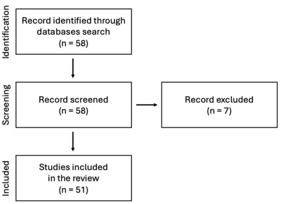 This manuscript presents a narrative review of the current state of knowledge on the use of chitosan-based sponges in dental applications. A comprehensive search of scientific literature was conducted using PubMed database. The keyword sequence used to search the database was the following: (“chitosan”) AND (“sponge” OR “sponges”) AND (“dentistry” OR “oral surgery” OR “dental” OR “stomatology”) AND (“periodontitis” OR “wound healing” OR “bone”). The search strategy focused on original research and review articles published in peer-reviewed journals, with particular emphasis on chitosan and its application in the form of sponges within dentistry, especially in areas such as periodontal disease, wound healing and tissue regeneration. Abstracts were screened to assess the relevance of each article. Inclusion criteria were limited to English-language papers published before mid-2025. Figure 1 illustrates the adopted literature search strategy.