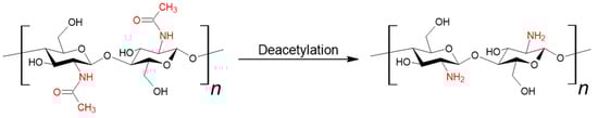 Chitin (β-(1-4)-poly-N-acetyl-D-glucosamine) is one of the most abundant naturally occurring polysaccharides, ranking second only to cellulose. It is the primary component of the exoskeletons of crustaceans, crabs, and shrimps. It is also a structural element of the fungal cell wall [12,13,14]. Chitosan can be obtained from chitin through deacetylation (see Figure 2). This process is most carried out using a strong base, and less frequently through enzymatic methods or the use of ionic liquids. The key parameter distinguishing these two polymers is the degree of deacetylation; a value equal to or greater than 50% qualifies the material as chitosan [15].