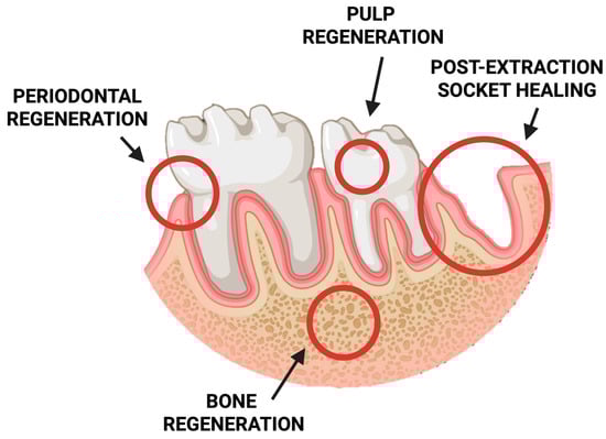 A noteworthy topic is the regeneration of dental pulp, which can be damaged by various factors such as bacteria, physical trauma, or temperature [82]. Root canal treatment, which involves the removal of the pulp, may result in the weakening of the tooth, which is also deprived of its ability to respond to sensory stimuli and to mount an immune response [83]. Methods aimed at pulp regeneration can spare the tooth from root canal treatment, thereby preventing it from becoming weakened.