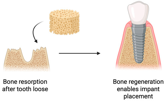 Following tooth loss, biological processes occur within the alveolar bone, leading to bone resorption and atrophy. This poses challenges for implant placement [95,96]. Insufficient bone volume negatively affects the long-term success of implantation and, in some cases, makes it impossible [97]. To prevent this or to restore the lost bone, various strategies are employed [98]. Bone reconstruction is a commonly used practice in implantology [99]. Scaffolds used for bone regrowth can release active substances that support its growth [100]. Current research indicates that the type of biomaterial used has an impact on bone regeneration [99,101]. One of the biomaterials used in bone tissue regeneration is chitosan. It can be applied both on its own and in combination with other materials [102,103,104]. Chitosan exhibits a range of properties that make it an attractive material for bone tissue engineering. It actively supports the bone regeneration process by stimulating osteoblast differentiation, increasing bone density, and accelerating fracture healing (Figure 8) [105].