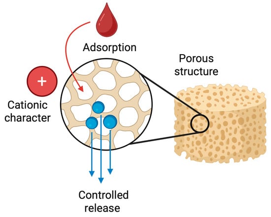 Chitosan-based sponges function not only as structural scaffolds but also as efficient and biocompatible drug delivery platforms. Their highly porous architecture, large internal surface area, and cationic character enable the adsorption, entrapment, and controlled release of a wide range of therapeutic agents [113]. Drugs may be incorporated directly into the polymer matrix during fabrication or introduced through post-loading, while chemical modification, crosslinking density, and pore size allow precise tuning of release kinetics (Figure 9) [114].