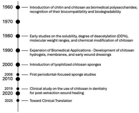 Timeline of Key Milestones in the Development of Chitosan Sponges for Dental Applications.