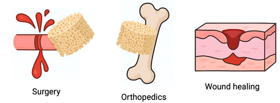 Nano-engineered sponges further expand therapeutic functionality. The incorporation of titanium oxide nanoparticles into chitosan matrices increased mechanical integrity, antibacterial performance, and osteoinductivity, with significantly elevated expression of osteogenic markers such as DMP-1 and osteocalcin in vitro [116]. Hybrid chitosan–hydroxyapatite sponges loaded with ciprofloxacin demonstrated dual performance: rapid hemostasis and strong antibacterial effects, while simultaneously providing osteoconductive support for bone repair [56].