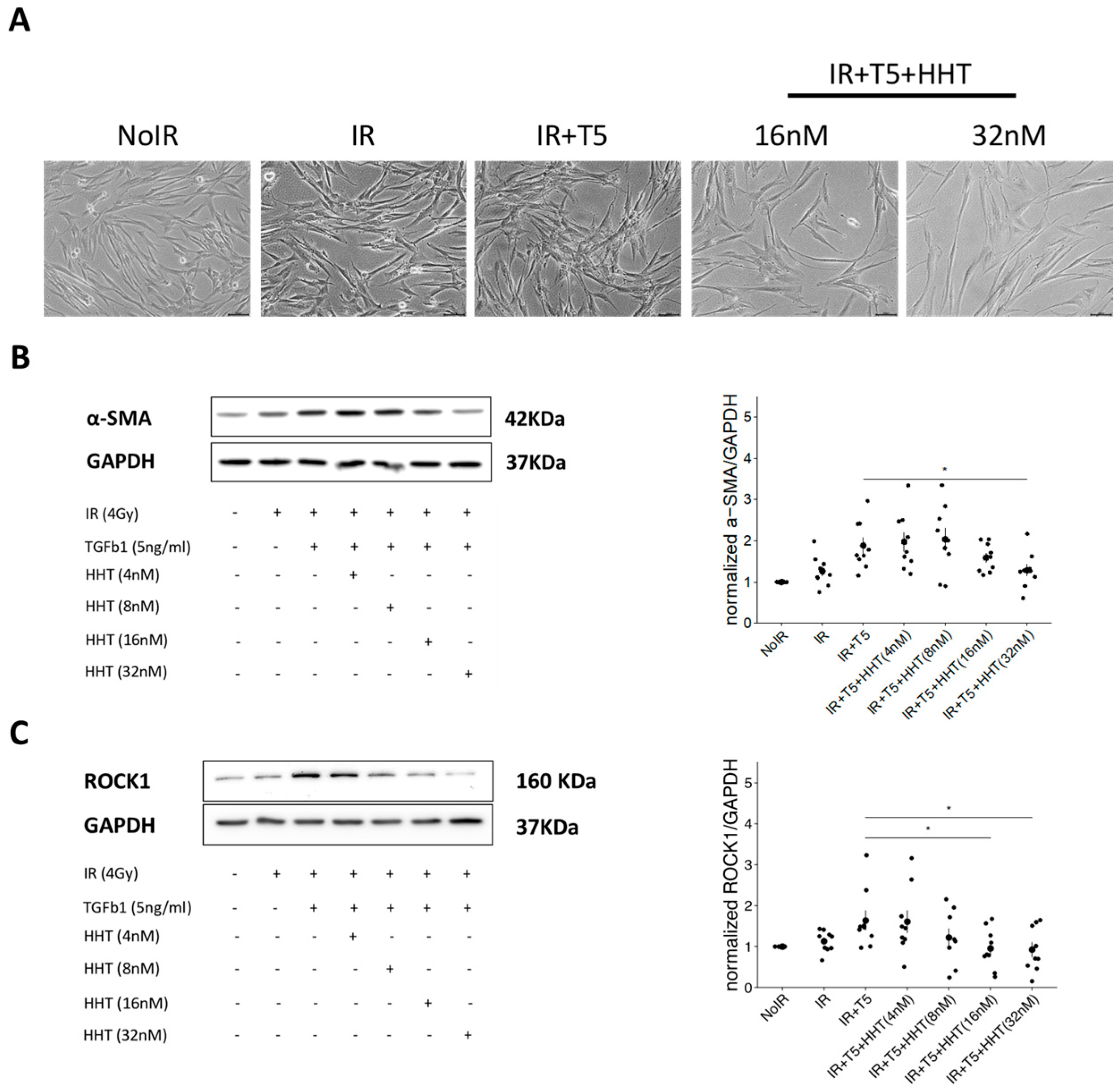 36], which is consistent with the dose range employed in our experiments. Notably, HHT exhibited stronger anti-proliferative effects in irradiated (activated) fibroblasts compared to non-irradiated cells, suggesting preferential targeting of pathological phenotypes with reduced toxicity to normal tissue. Several molecular parallels exist between RPF and idiopathic pulmonary fibrosis (IPF), including epithelial–mesenchymal transition (EMT), excessive ECM deposition, and myofibroblast-driven lung tissue remodeling. The RhoA/ROCK pathway plays a central role in fibrogenesis by promoting fibroblast contractility, α-SMA expression, and collagen production. Dual inhibition of ROCK1 and ROCK2 has been shown to suppress COL1A1 and α-SMA expression and disrupt stress fiber formation in both animal models and MRC-5 cell lines [
