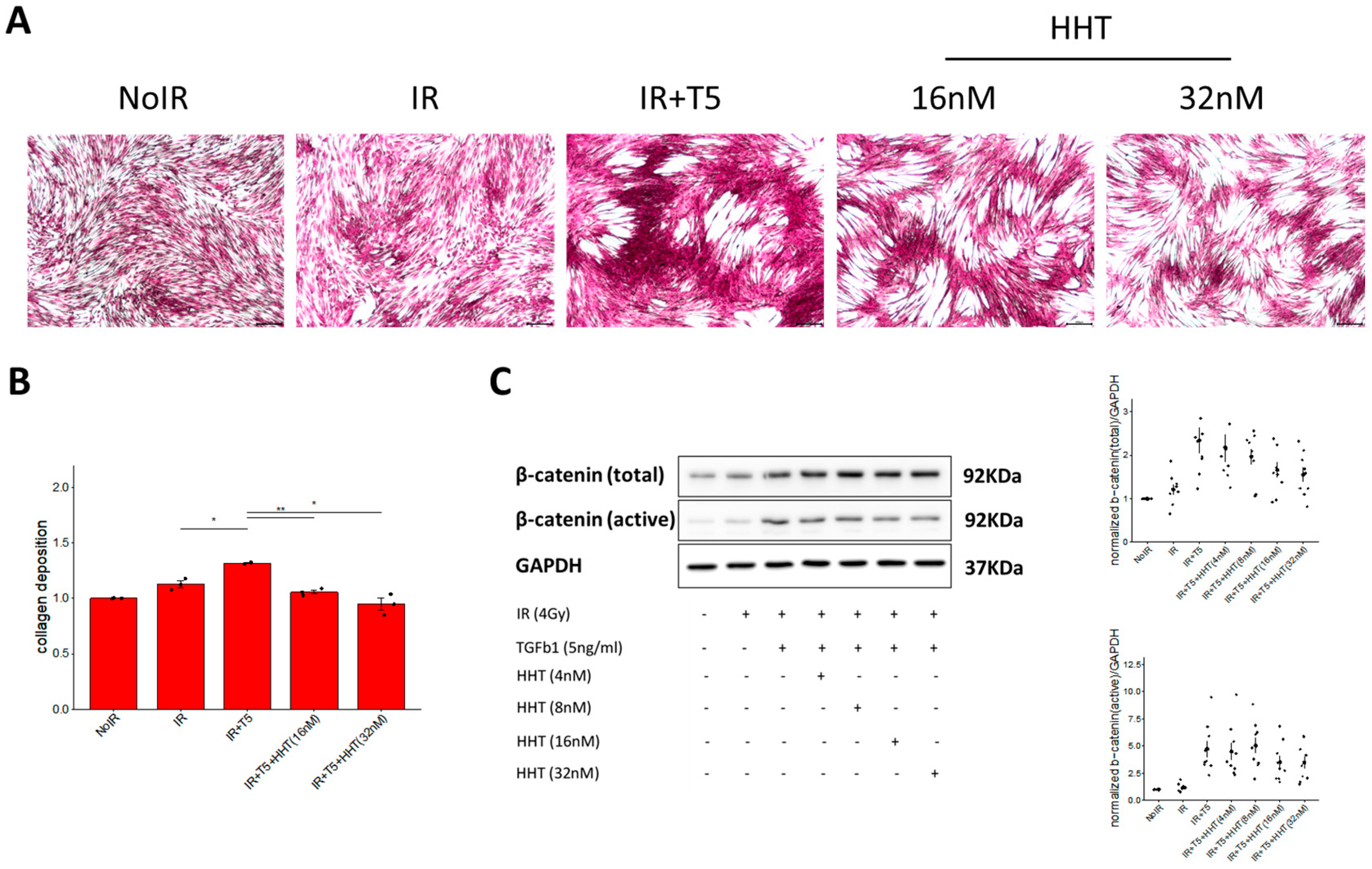 MRC-5 cells were seeded in 6-well plates and maintained in the abovementioned condition overnight. Then, cells were activated by IR with 4 Gy followed by addition of 5 ng/mL of recombinant human TGF-β1 and then incubated in the same condition for 72 h. Then, cells were washed by PBS, fixed with cold 75% ethanol for 1 h, washed again with PBS, and stained with Direct Red 80 dissolved in picric acid (w/v) for 1 h. Cells were washed with 0.01 N HCL to remove unbonded stain, and then photographed under microscope for image staining analysis using ImageJ v1.54d.