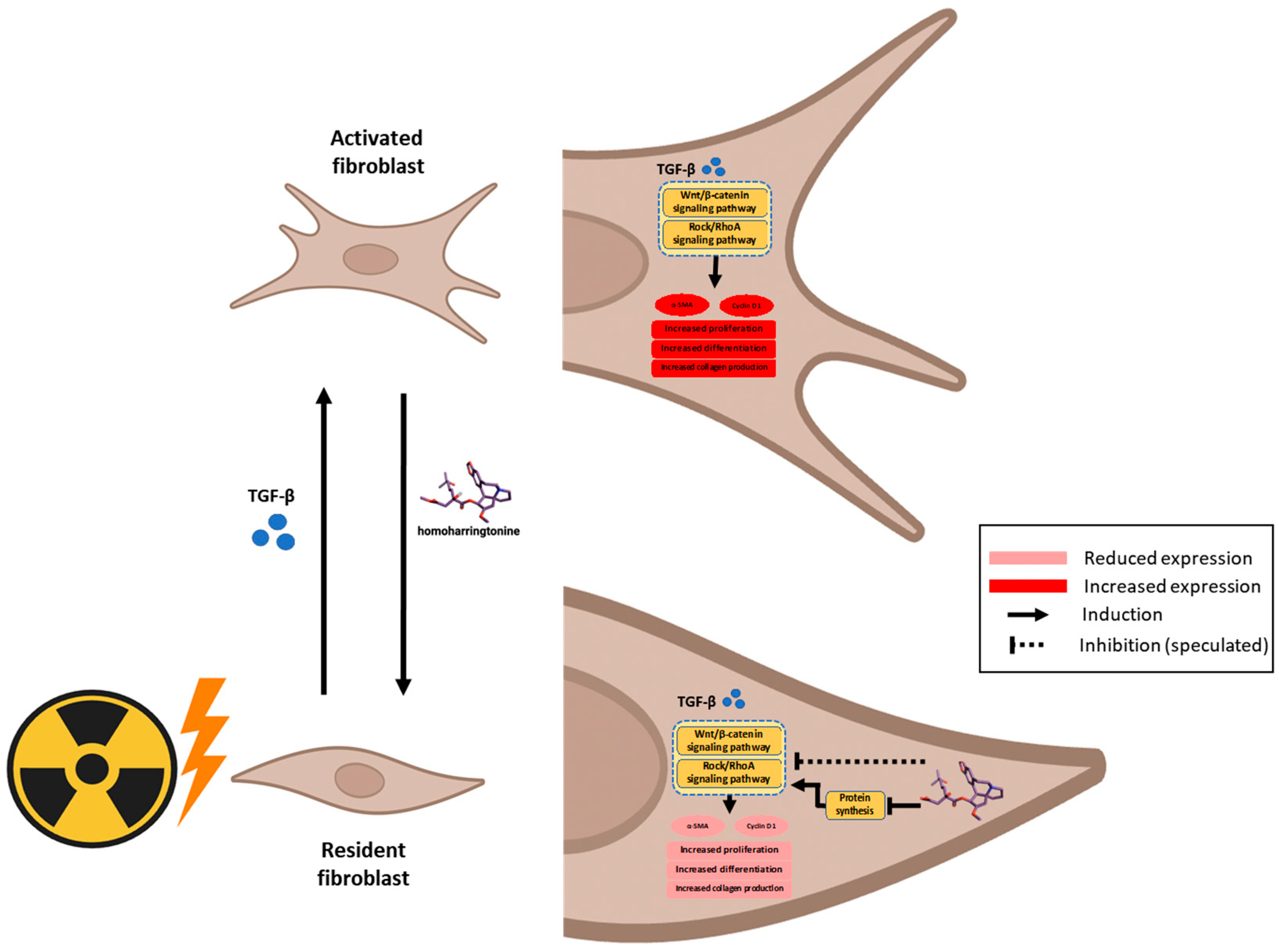39]. Given that pro-fibrotic remodeling is mediated by a limited set of conserved molecular pathways, most anti-fibrotic agents—including HHT—are naturally expected to converge on these canonical nodes. Accordingly, our goal was not to propose a novel molecular target for HHT, but to establish its relevance to radiation-triggered fibroblast activation using RPF-specific transcriptomic data. This distinction is essential, as the radiation-induced fibrotic environment differs markedly from idiopathic or post-surgical fibrosis, both in cytokine composition and in gene-expression patterning. By repositioning HHT to this radiation-specific disease context, our study fills a previously unaddressed therapeutic gap.