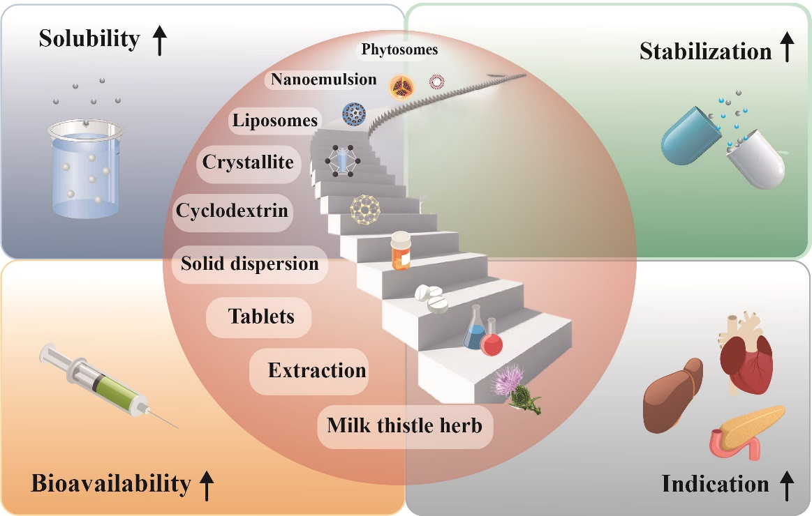 | Phytosomes/Phospholipid Complexes | Silybin–phosphatidylcholine | Membrane permeability ↑ | Bioavailability ↑ 9.6× | High phospholipid cost; variability | [62] |