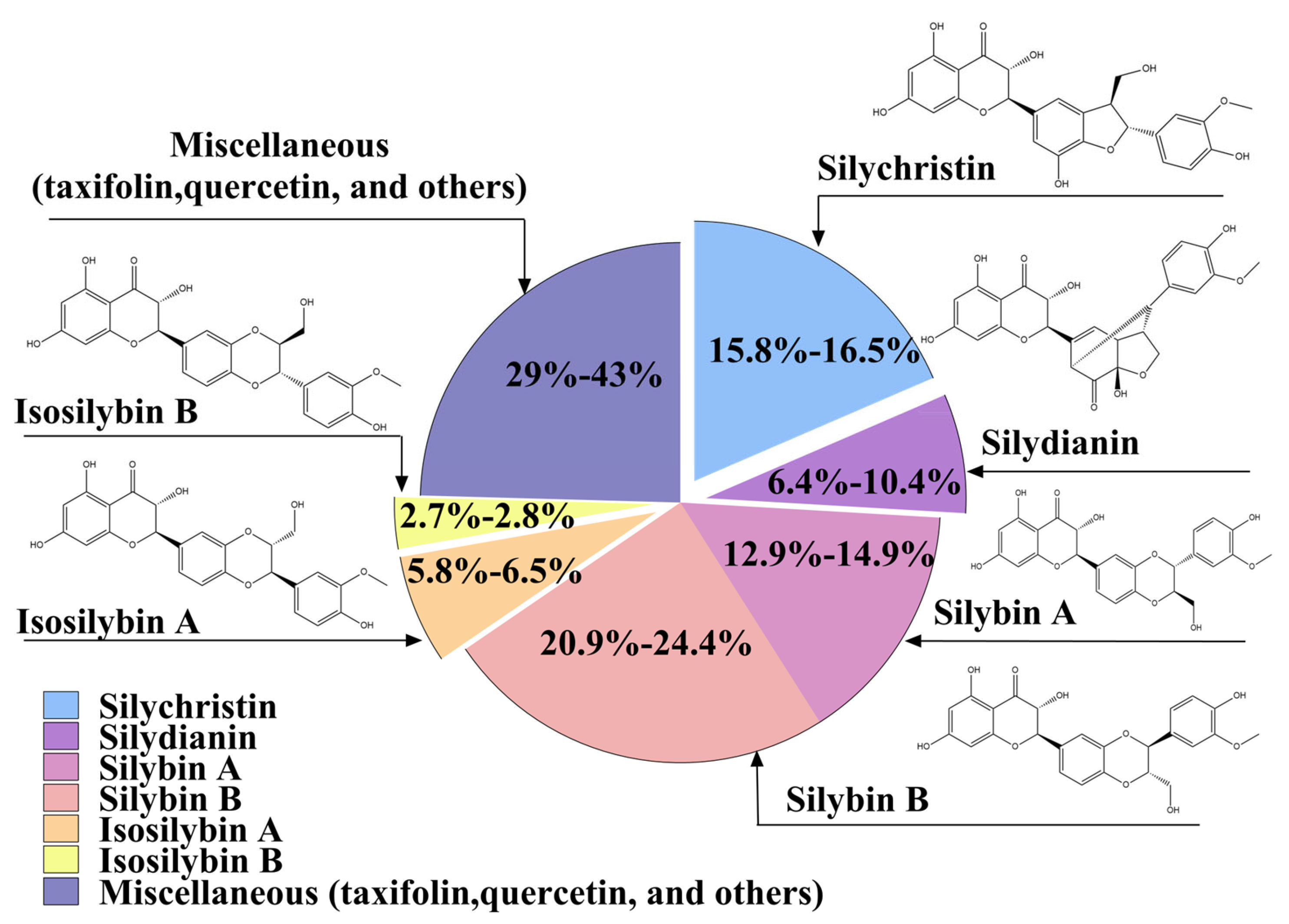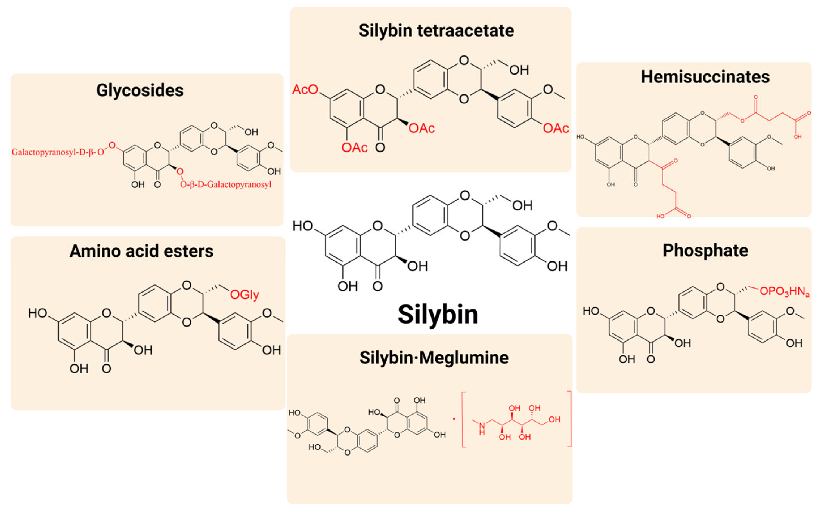 - Delmas, D. Silymarin and Derivatives: From Biosynthesis to Health Benefits. Molecules 2020, 25, 2415. [Google Scholar] [CrossRef]